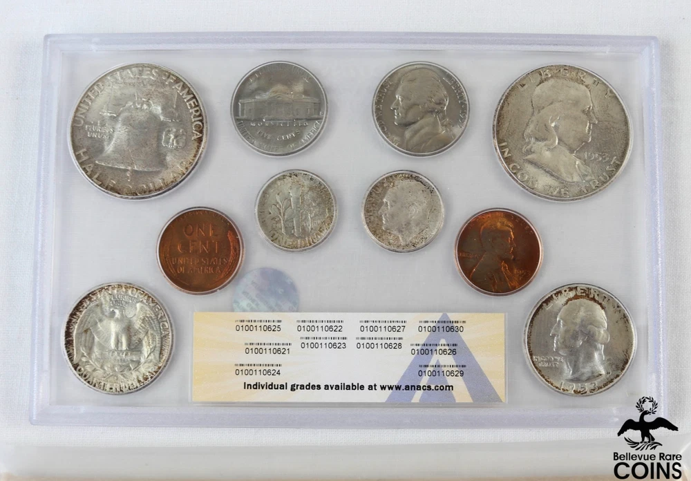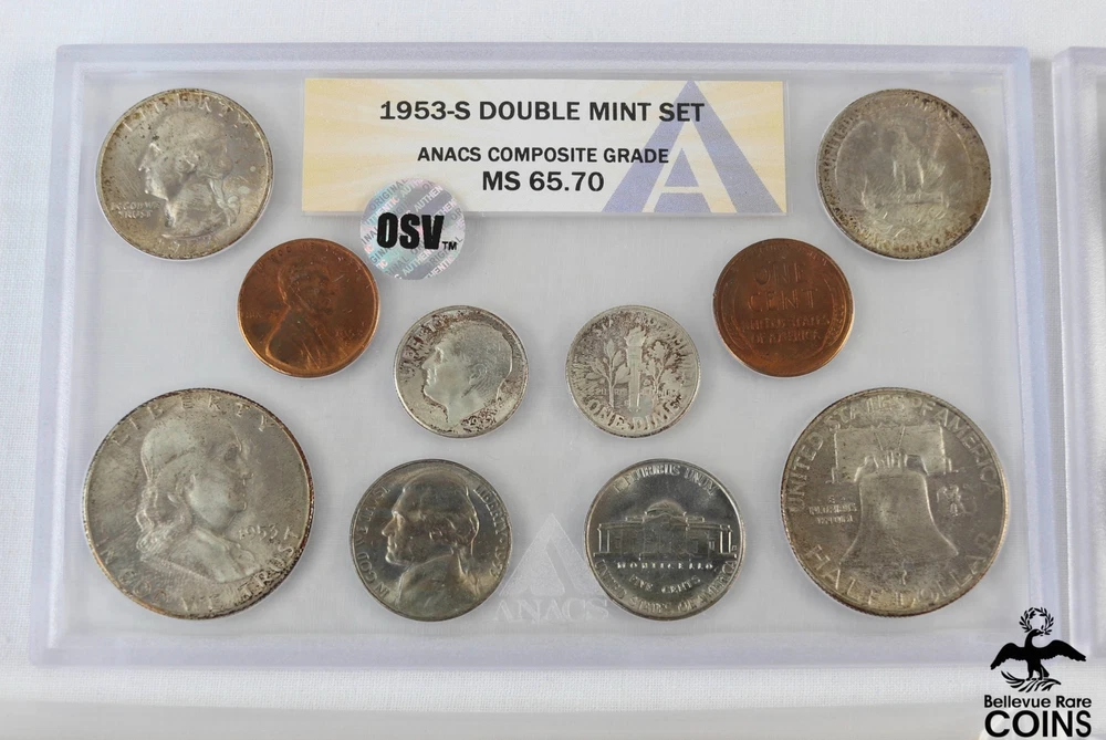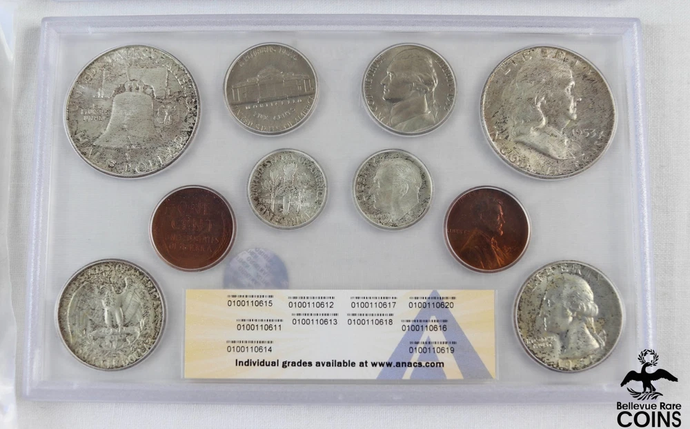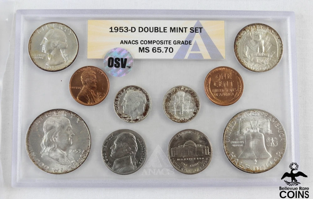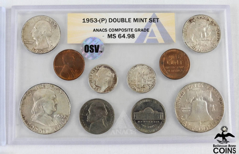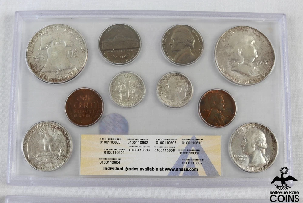 Lot of 3: 1953 P D & S Double Mint Sets ANACS Composite Grade w/US Mint OGP Lot of 3: 1953 P D & S Double Mint Sets ANACS Composite Grade w/US Mint OGP *Total ASW: ~ 1..22 oz. *Please SEE PHOTOS for condition. If you should have any questions or concerns, please feel free to message us Monday - Friday 9:00am - 5:00pm via eBay’s “Ask question” button below. We add hundreds of new coin and bullion listings weekly. We encourage you to check out our other listings and our eBay auctions! Click Here To See All Bellevue Rare Coins Gold Bullion L istings Shipping & Returns: $4.00 USPS Ground Advantage shipping within the United States, unless otherwise noted in listing. Shipping and Handling: Domestic Shipments - Bellevue Rare Coins provides $4.00 United States Postal Service (USPS) Ground Advantage shipping with tracking for all shipments within the United States, unless otherwise specified. International Shipments - All International orders are shipped via eBay's International shipping program. International Shipping and handling fees will be determined at check out. Please contact us for shipment fee estimates. Combined Shipping - Bellevue Rare Coins offers combined shipping for domestic buyers who have won multiple auctions. We will send out updated invoices with discounted shipping costs on Monday mornings. Please wait until you receive the updated invoice from us to make your payment. We do not offer combined shipping for International Buyers. Return Policy - Bellevue Rare Coins has a 30-calendar day return policy. All returns must be shipped within 30 calendar days of receiving the product. All returned items must be in their original packaging. All return requests must be made within 30 calendar days of customer receiving the merchandise. When returning merchandise, please include the item number, as this will expedite the refund process. Bullion Returns - Customer may (at Bellevue Rare Coins' discretion) be required to pay for any market loss on their returns. Any market gain on refunds shall remain the property of Bellevue Rare Coins. Listing Information: Product Photography - Bellevue Rare Coins does not use stock photos. Items in our listings have been photographed by our team in-house, so you can trust that you're making an informed purchase, ensuring transparency and authenticity. Messages - We greatly value your messages and are committed to responding to your questions and inquiries as promptly as we can. Nevertheless, please understand that immediate responses may not always be possible. Kindly note that we are unable to respond to messages on weekends, but we assure you that your inquiries are important to us, and we will get back to you during our working hours as soon as possible. About Bellevue Rare Coins Bellevue Rare Coins is a family-owned and operated business who have been proudly offering their services since 1979. We are the leading rare coin and currency dealer in the Greater Seattle Area who also specialize in jewelry and estate items. We are focused on delivering a simpler experience to our customers. Providing a reputation that dramatically affects our consumers in a positive way. We ensure that our clients always feel welcome and valued.