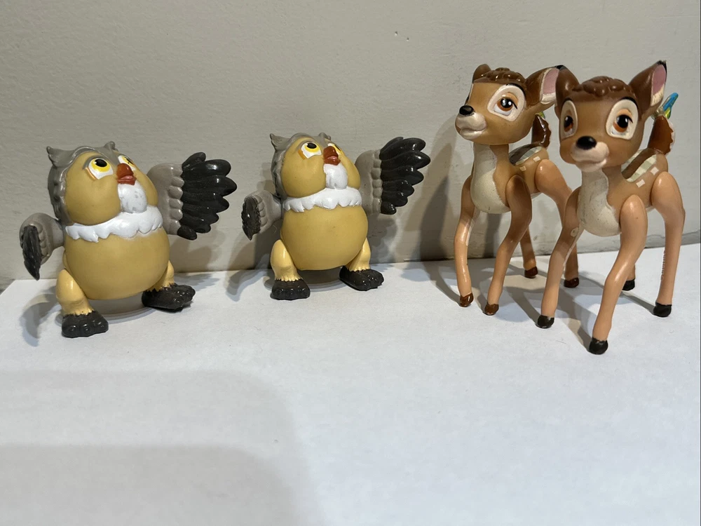 This lot of four vintage McDonald's figures features two beloved Disney characters, Bambi and Owl, standing at heights of 2.5-3.5 inches. These contemporary figurines were manufactured in China and are part of the Disneyana franchise. Perfect for collectors, they are a must-have for any Disney fan.