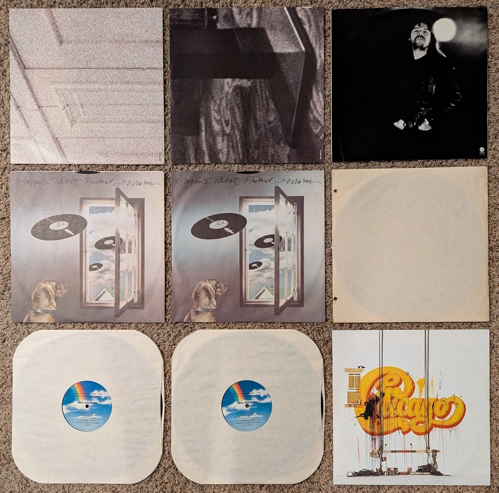This listing is for the following 6 vinyl LP albums (9 total records, 12" 33 RPM): Steely Dan - Greatest Hits (1978, AK-1107/2) *2 records* Peter Frampton - Frampton Comes Alive! (1976, SP-3703) *2 records* Tom Petty and the Heart Breakers - Pack Up the Plantation-Live! (1985, MCA2-8021) *2 records* Bob Seger and The Silver Bullet Band - Night Moves (1976, ST-11557) Three Dog Night - Captured Live at the Forum (1969, DS 50068) Chicago - Chicago's Greatest Hits (1975, PC 33900) Records are in nice condition with no warping and include jackets and inner sleeves. Jacket for Three Dog Night has holes punched in the left side.