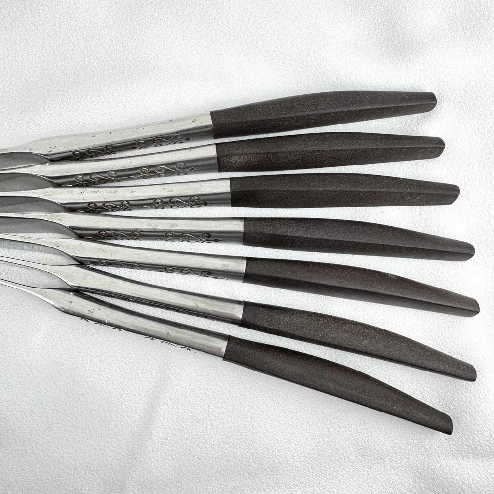 Offering a set of 7 Interpur INR2 dinner knives 8 7/8” long, mid-century modern style, a discontinued pattern made in Japan. The brown synthetic handles are sturdy and have cracks, as shown in the close-up photos. The stainless steel is in good condition, no chips, dents, or disposal damage. There are surface scratches, some pitting, and wear consistent with normal use. Please view the photos for details and condition. Measurements and photo colors are approximate. For extra protection your items will be packed in plastic sleeves and shipped in a box. Shipping is your choice of USPS Ground Advantage or USPS Flat Rate Priority at the rate determined by eBay. Follow your item's delivery progress with the USPS website Tracking Tool. Terms of Sale: Photos are of the actual item you will receive and sold "as is". Placing an order is your agreement that you know what you are buying, have viewed the photos and find the condition acceptable. Use eBay Messages to contact me for questions or concerns about your order. Please inspect your items upon arrival and contact me if there are any problems. Free returns within 30 days after delivery.