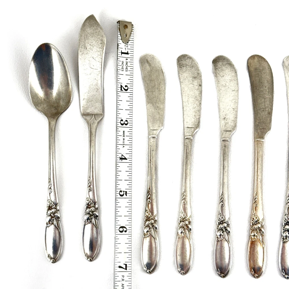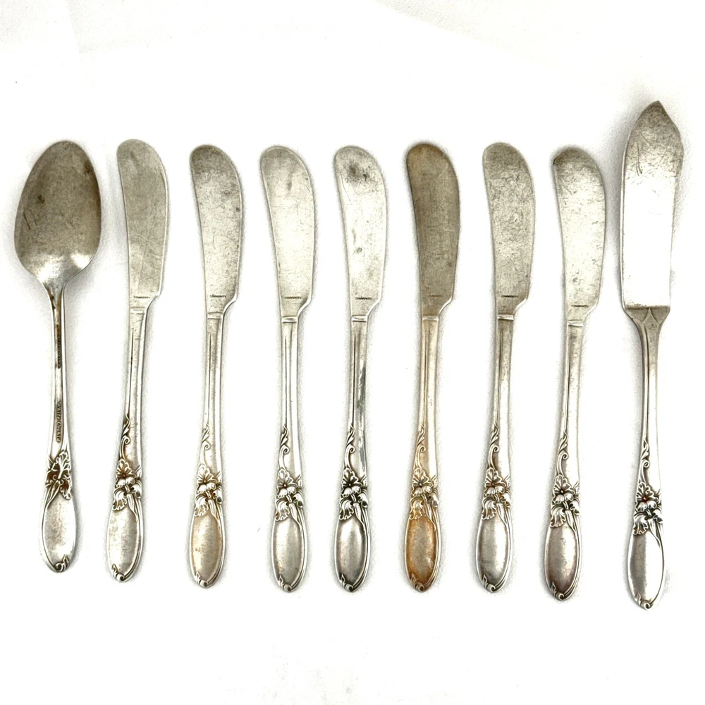 Offering a lot of 9 WHITE ORCHID unpolished silver-plated flatware by Oneida Community. Good condition, no bends, dents, or disposal damage. Wear is consistent with normal use. Please view the photos for details and condition. The lot includes: 7 butter spreaders 6.25” 1 master butter knife 6 7/8” 1 teaspoon 6 1/8” Measurements and photo colors are approximate. Shipping is your choice of USPS Ground Advantage or USPS Flat Rate Priority at the rate determined by eBay. Terms of Sale: Photos are of the actual item you will receive and is sold "as is". Placing an order is your agreement that you know what you are buying, have viewed the photos and find the condition acceptable. If you have any questions or concerns about your order, contact me through eBay Messages. Please inspect your item upon arrival and contact me if there are any problems so we may work out a solution, before you leave feedback or request a refund . No returns please.