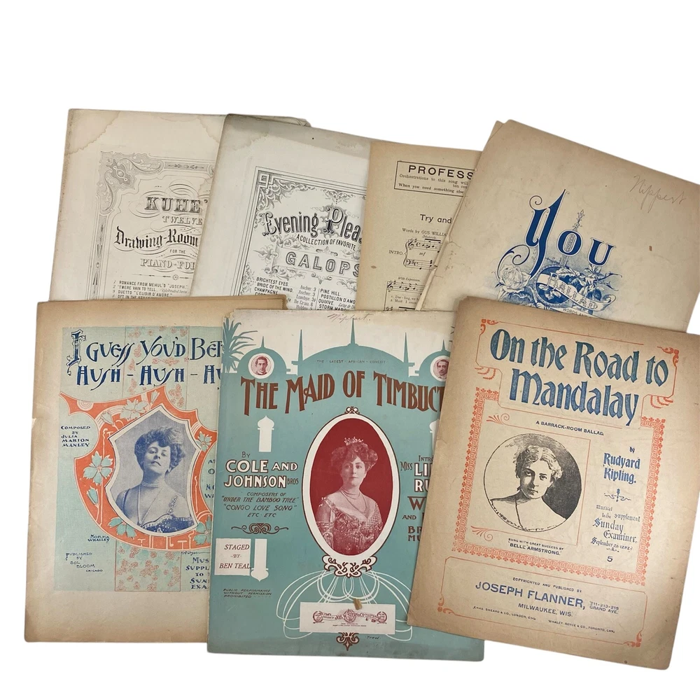 Dive into a treasure trove of musical history with this extensive lot of over 90 vintage sheet music pieces. Signs of wear, stains, rips present. Each piece is a testament to the golden age of piano vocals and musicals, offering a unique glimpse into the past with its very worn pages telling stories of performances and practices. The collection features an eclectic mix, showcasing a wide range of genres and composers. It's an ideal find for collectors, musicians, or anyone with an appreciation for the tactile beauty of analog music. Whether for performance, display, or research, these sheets are a tangible link to musical heritage.