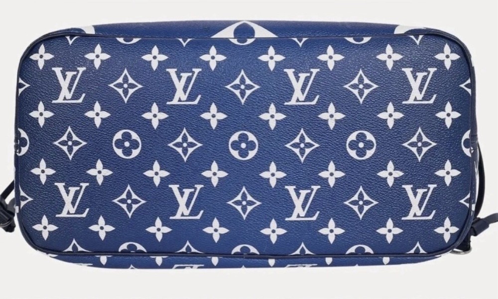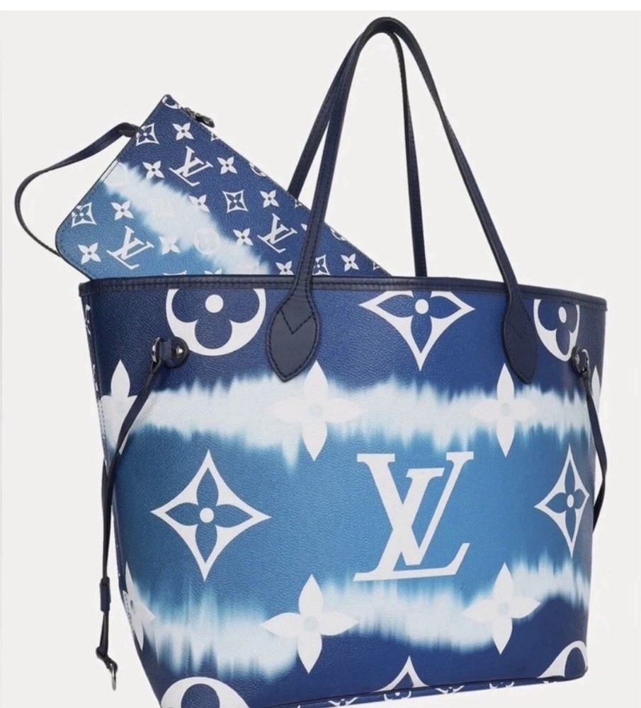 This Louis Vuitton Escale Giant Neverfull MM Tie Dye Tote Handle Shoulder Bag in Blue is a stylish and functional accessory for women. The bag features a unique tie-dye pattern, and the handle and strap are made of leather in a beautiful blue color. The bag is large and has a silver hardware color, with a fabric lining in blue. The bag also comes with a wristlet and original dust bag, making it a complete set. The Louis Vuitton Neverfull MM model is a popular choice for those who want a large, versatile bag. This shoulder bag is perfect for everyday use or for special occasions.
