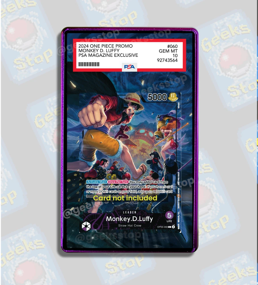 Display and protect your graded Monkey D Luffy PSA Magazine Exclusive Leader slab set with this extended art custom display case for your PSA or Beckett BGS slab. Make sure you select the right variation corresponding to your slab. This display case features a hand-made custom art to take your Monkey D Luffy graded card to the next level without adding any unnecessary bulk! Looking for an ungraded card holder? Check my other listings for more One Piece card game products. Note that the Manga Luffy OP05 060 Alternate Art card and slab are not included.
