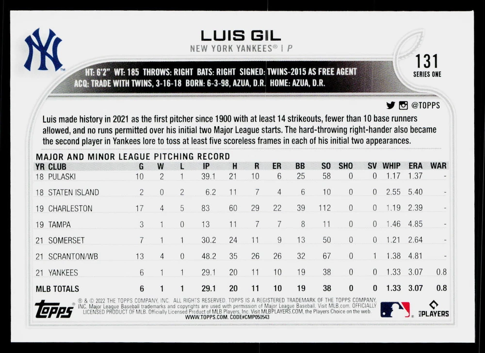 You will receive a , Luis Gil 2022 Topps #131 New York Yankees Near Mint or Better condition. Please note i am not a professional card grader the condition of raw cards can be very subjective. Please refer to the high quality pictures to determine condition yourself any questions at all please feel free to ask!! we take pride in the quality of cards we sell and ship, all cards will be shipped in a penny sleeve and top loader for added protection. be sure to save us as a seller, as we are growing and listing daily THANK YOU FOR YOUR BUSINESS