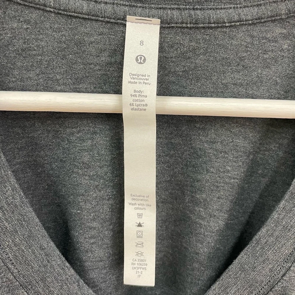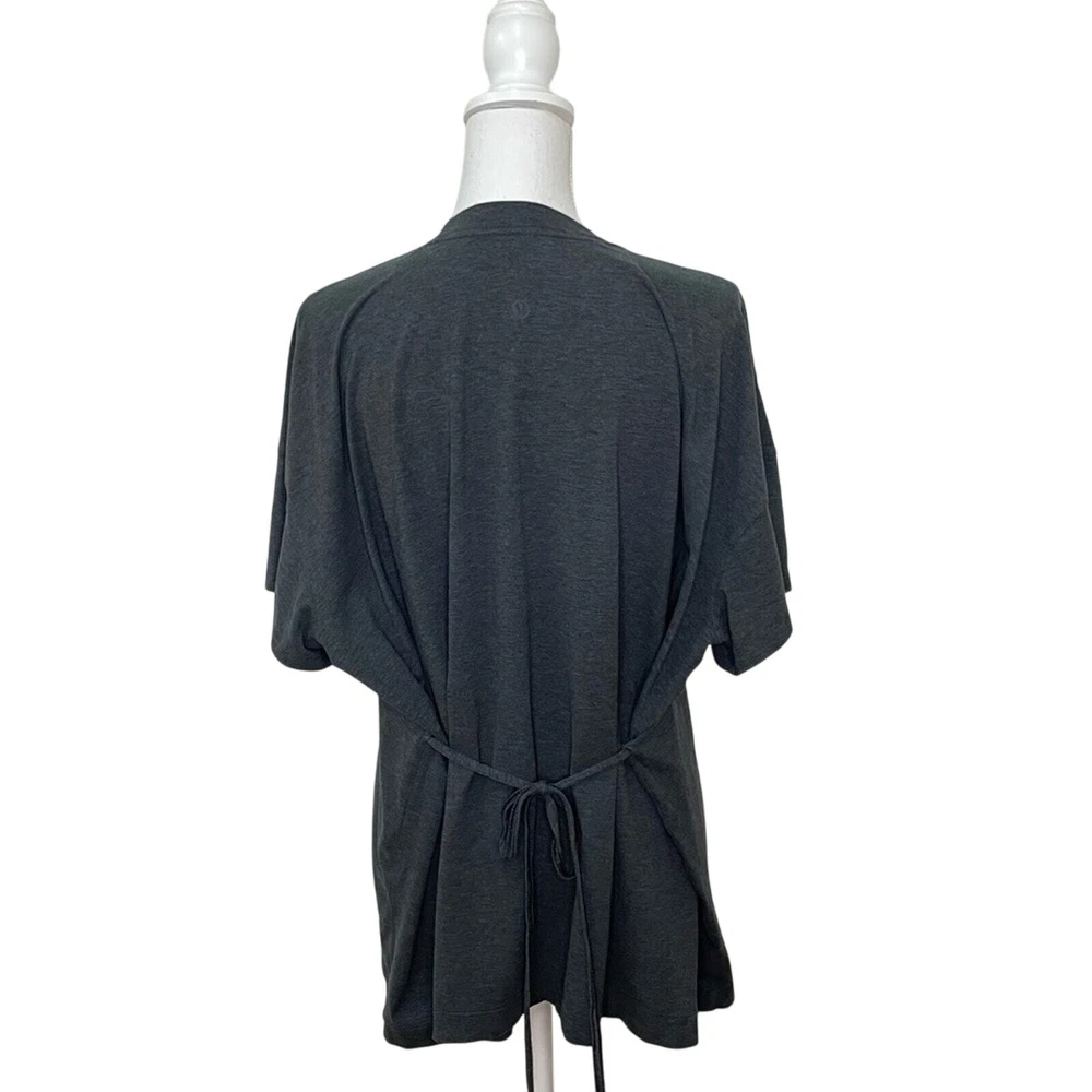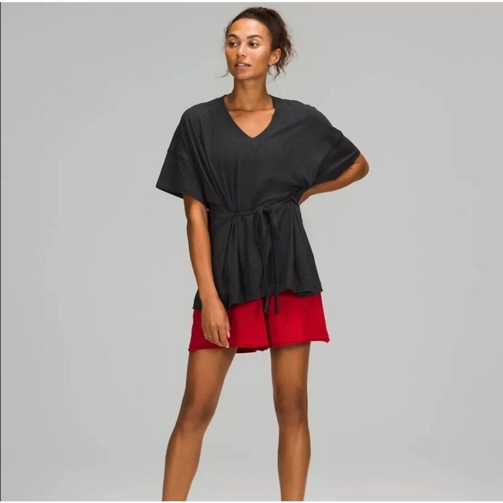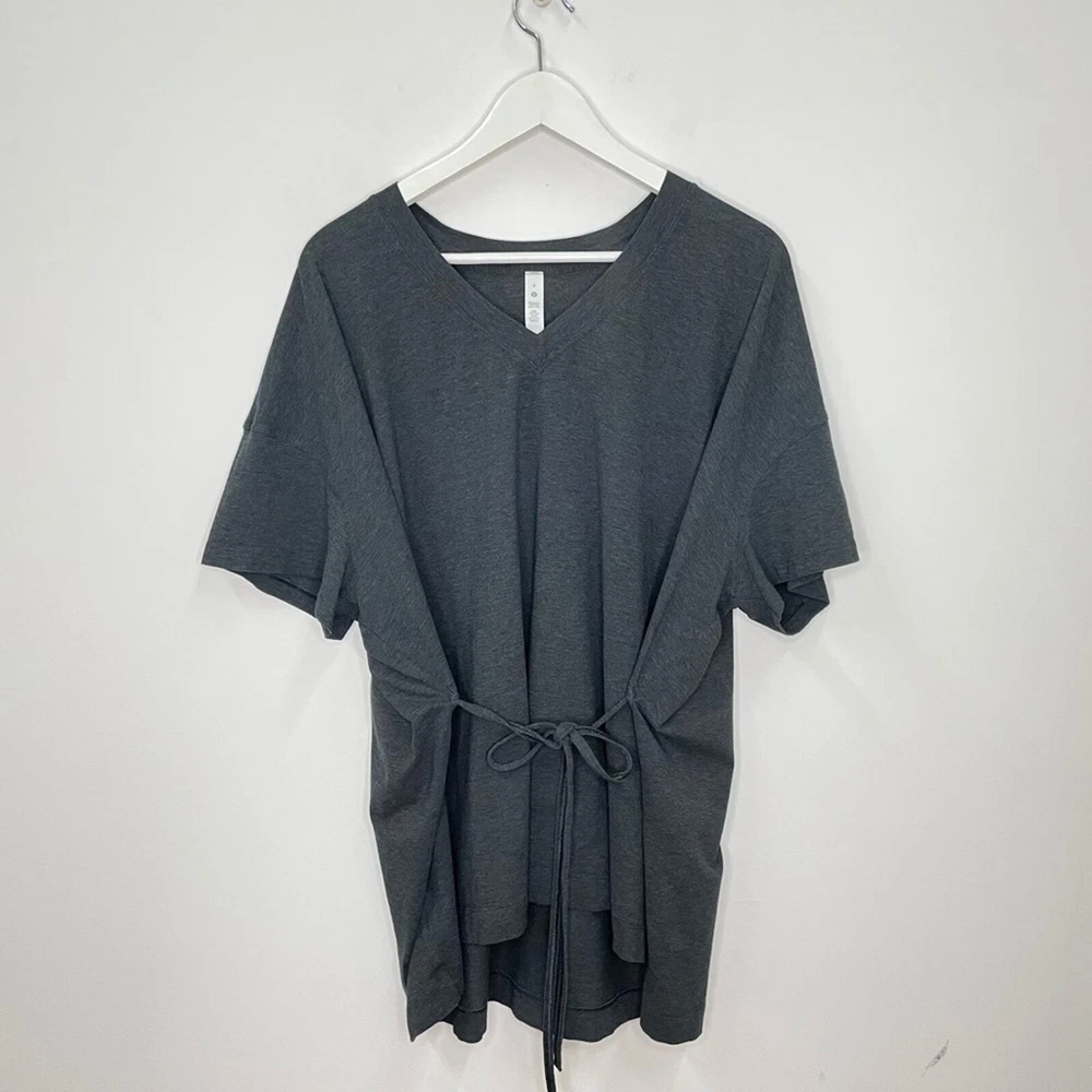 Lululemon Women’s Charcoal Gray Oversized Side Tie V-Neck Short Sleeve Tee Breathable Pima cotton Lycra for stretch Ties on each side Oversized, relaxed fit V-neck Size 8 *approximate measurements: Pit to pit- 30” Length- 26” *excellent preowned condition