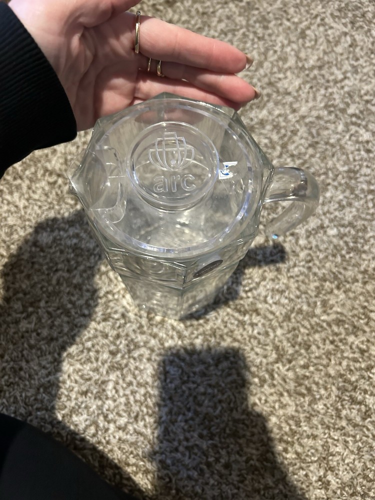 This is a Clear Glass Luminarc Octime Octagonal Crystal Pitcher, Jug, made in France by Arcoroc. The pitcher features an octagonal design and is suitable for all occasions. It is made of high-quality glass and crystal materials. Personalization is not available for this item.