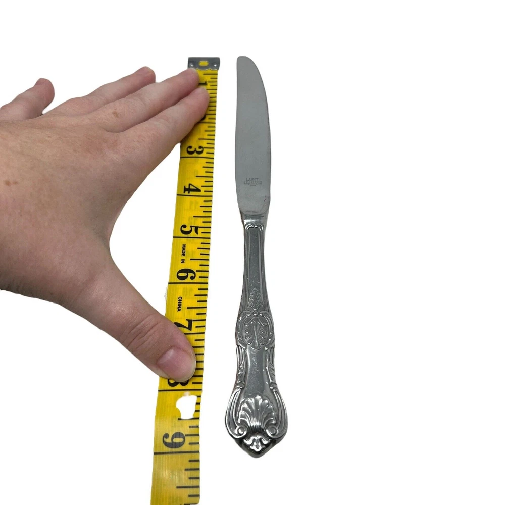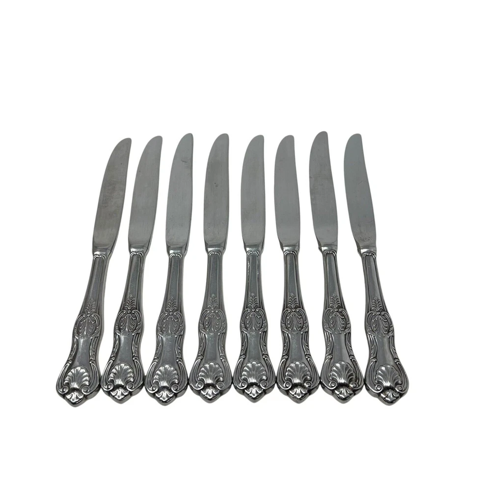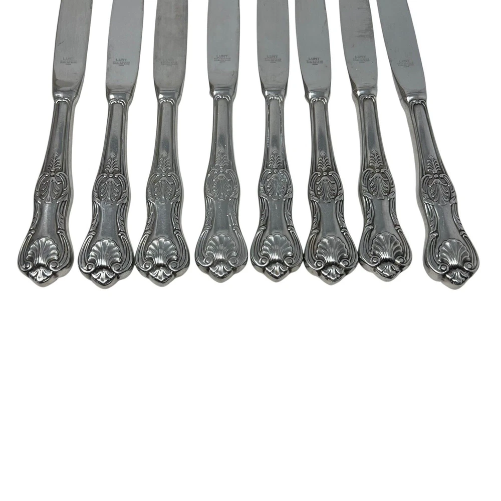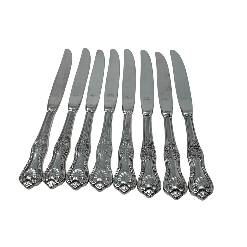 Lunt Silver "Hillsborough" Stainless Modern Hollow Dinner Knife Set Of 8 Preowned, normal wear Dinner knives Could use a thorough cleaning / polishing