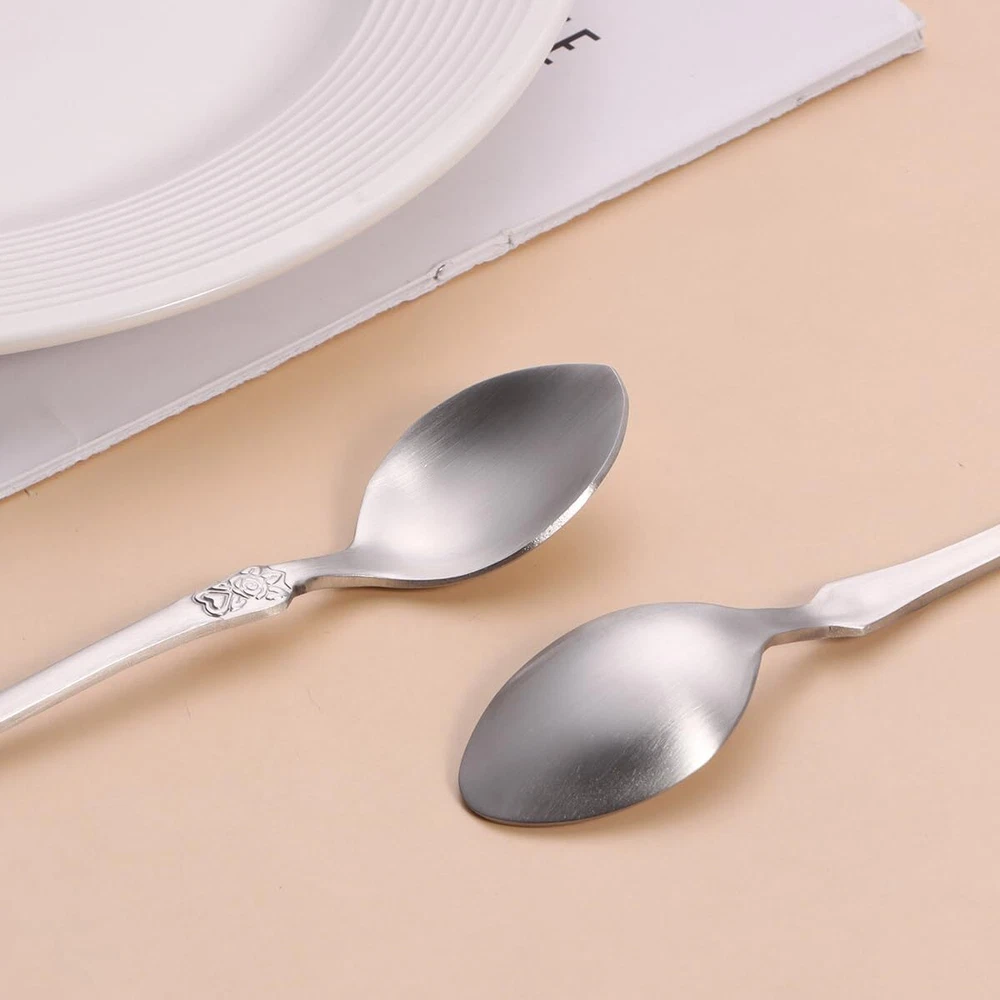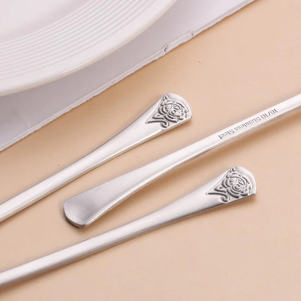 SET OF 4 ICE TEA SPOON: 4 pieces 9 inch long handle spoons, large quantity to meet various purposes of your daily life. Great for Bar, home, party use,daily use or special events QUALITY MATERIAL: Our ice tea spoons are made of food grade material 18/10 Stainless Steel with extra thick ergonomics handle,safety,Non-toxic and odorless and durable high-matte stain finish ATTRACTIVE DESIGN: Fashionable and unique, with creative designs featuring rose and heart patterns on the handles that are suitable for all daily mixing needs PERFECT LONG HANDLE: The classic straight tail thickened handle is convenient and comfortable grip, can directly lead to the bottom of Ice cream soda glass, sundae and dessert cup, milk shake, etc.Very suitable for digging food in the corners of deep jars and mango headed ice spoons DISHWASHER SAFE: Our long ice tea spoons have matte stain finished surface and smooth edge definitely no rough spot make them are easy to clean, can be directly placed in the dishwasher for cleaning, save your time HOW TO PACKAGE: Each product has an independent packaging bag, and all products are packaged in an exquisite gift box that can be used as gifts