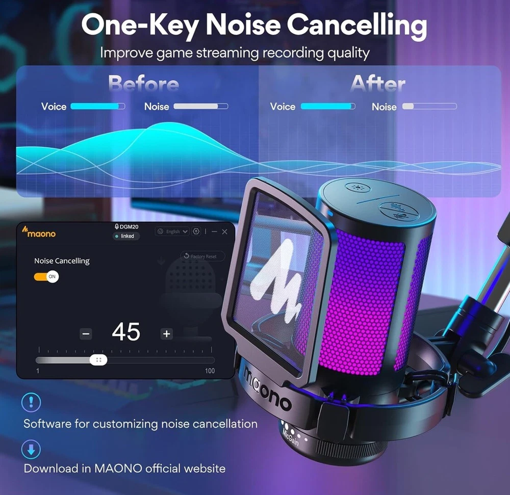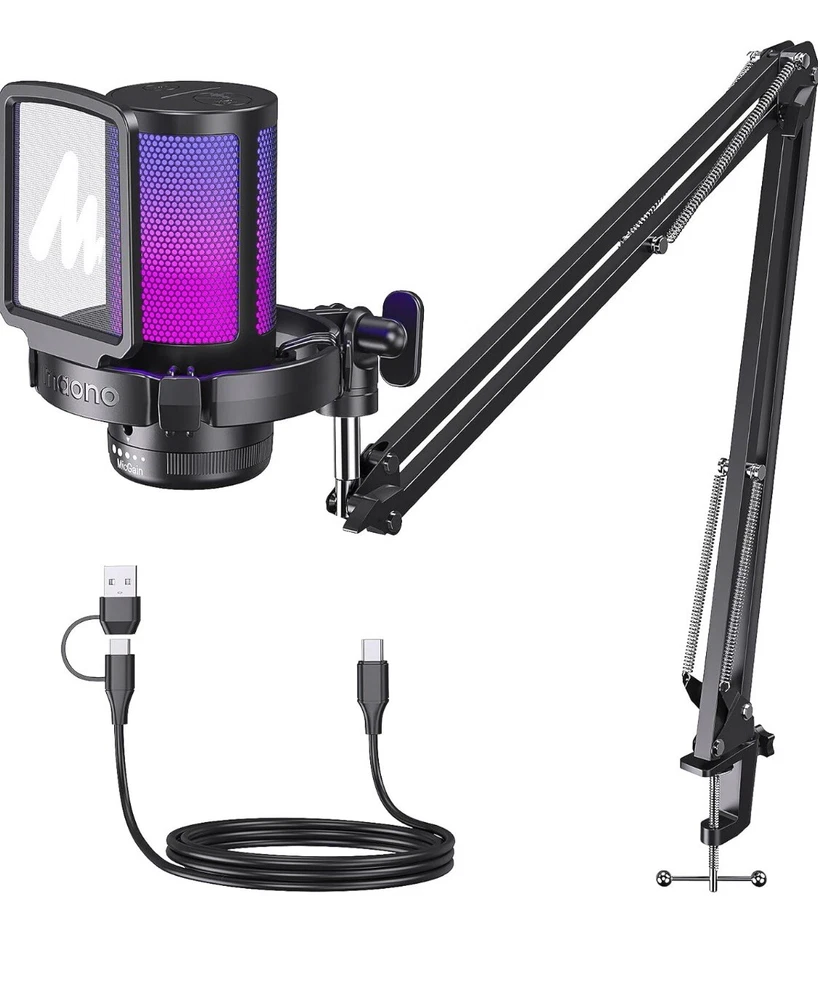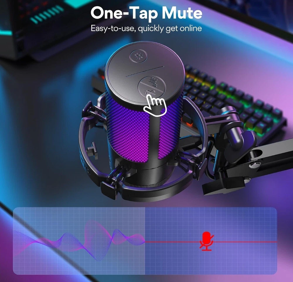 MORE FOCUS AND CLARITY - This gaming microphone with one-click noise cancellation technology, which can effectively eliminate background noise. Whether it's multiplayer online games, cooperative games, or competitive games, the USB microphone can capture game players' voices clearly, thereby enhancing the collaboration and competitiveness of the game. Cardioid pickup focuses more on capturing sound from the mic front, providing better sound quality and accuracy for gaming streaming or voice CONTROLLABLE RGB LIGHTING - You can change the color of RGB lights to match your game streaming aesthetic. The computer microphone has 9 personalized RGB lighting modes, Soft and coordinated lighting effects make your gaming video or gaming live broadcast stand out from the crowd. Long-pressing the RGB button turns off the RGB lights, while a short press turn on the lights and adjusts the light color EASIER MULTIFUNCTION USE - One-click the mute button on top of the PC microphone to turn on mute mode, and you can easily control your game audio. Take control of your on-stream sound with the mic gain knob, you can check if your voice level is too high or too low and adjust accordingly. The zero-latency monitoring allows you to easily maintain professional sound quality with a gaming mic PLUG AND PLAY - The game streaming microphone is compatible with Windows PC computer laptop, Mac, and PS5/4. The gaming USB microphone is ready to capture it when inspiration strikes. Just plug the mic straight into your computer or laptop with the included USB and USB C cable, and you're all set to record or stream, right away, No drivers are required. (Note: Not compatible with XBOX) STURDY & FLEXIBLE ARM STAND - The easy-to-position metal arm stand adjusts to support a variety of setups, You can quickly pull the podcast microphone near your mouth when in use, or fold it away to save more space. The shock mount can further reduce game-induced machine noise and vibration, and the removable pop filter can reduce noise without blocking the gaming computer screen WHAT YOU GET - The USB gaming PC microphone set package includes, USB condenser microphone*1, Metal Boom arm stand*1, Shock mount*1, Pop filter*1, USB and USB C cable*1, Desktop Clamp*1, User's Manual*1