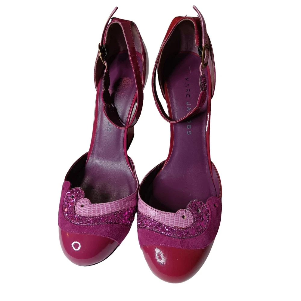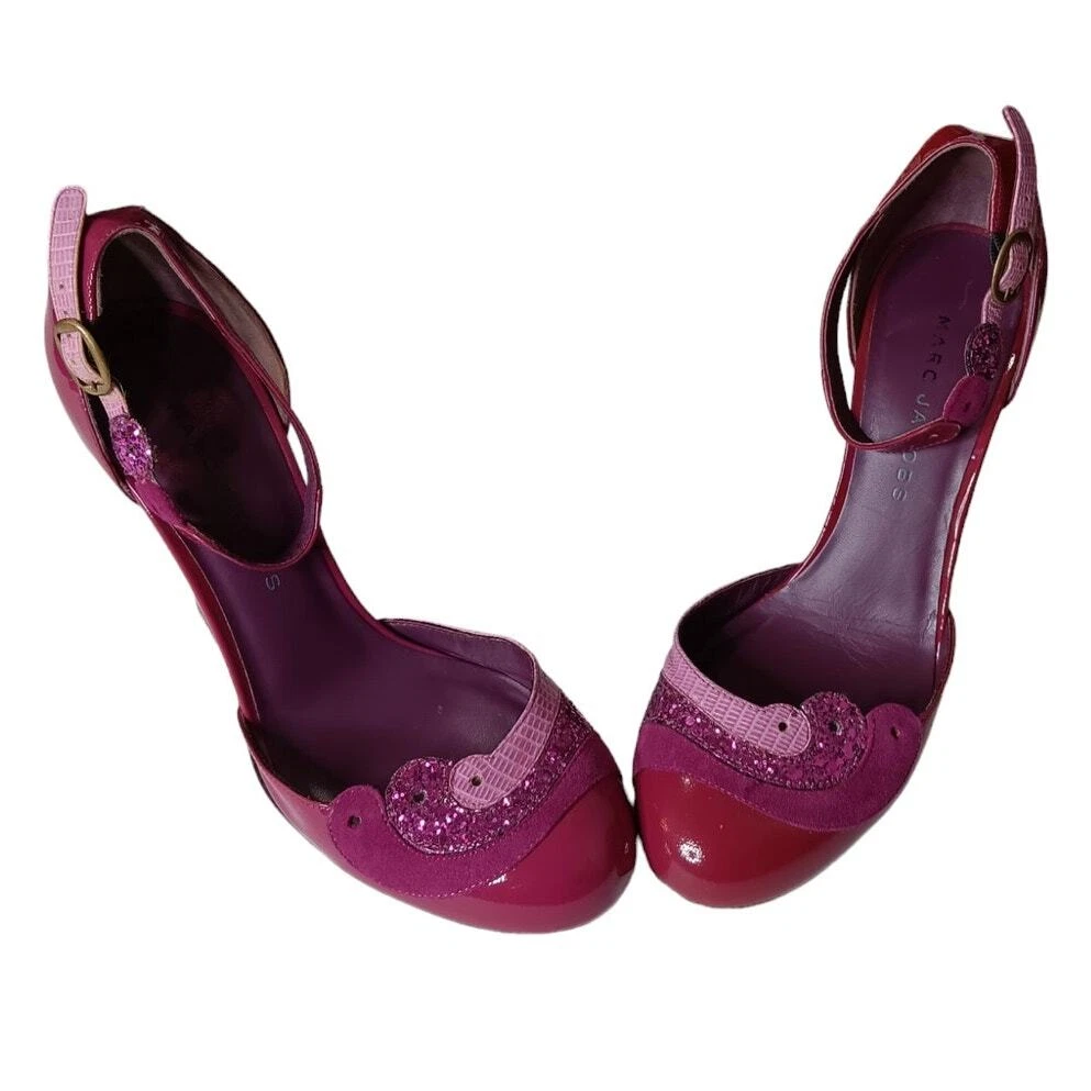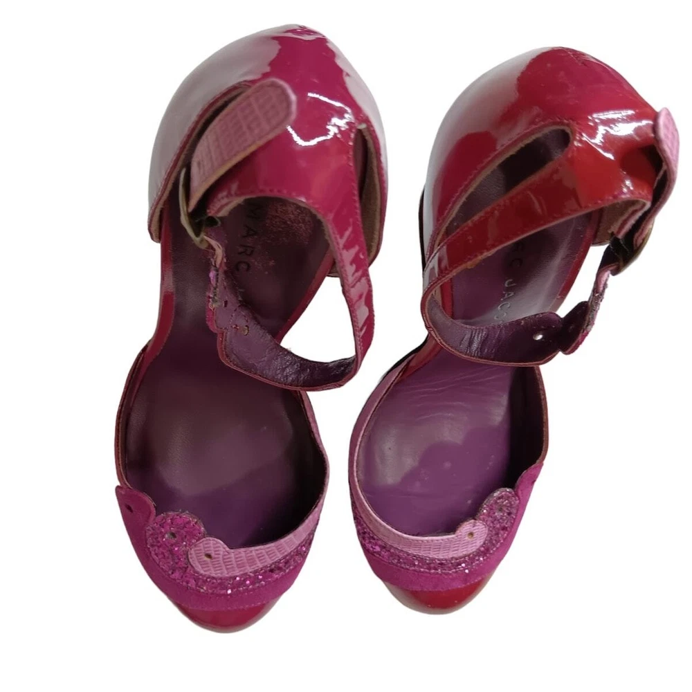 Super cute and girly! Pink and purple patent leather with sparkly trim. Gently worn. MARC JACOBS Retro Heels Wedges Pumps Shoes EU 36 or approximately a US 6 (per brand's size guide, but fit can vary by brand/style) Adjustable Ankle Straps Authentic In good pre-owned condition with some signs of wear such as minor marks, faint creasing and just normal wear. Pair in photos is the same pair for sale so please zoom in and review all pics carefully for full condition and signs of wear. No box or dust bag. Keywords: Designer Sustainable Bright Colorful Feminine Kawaii Pinup Flirty Coquette Girly Fairy Housewife Cute Dance Retro Work Career Office School Dressy Wedding Guest Party Photo Event Holiday Used Preowned Secondhand Smoke-free/pet-free home Color/texture may vary due to lighting/devices ID:SB/1.7