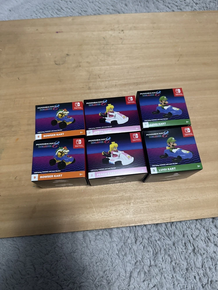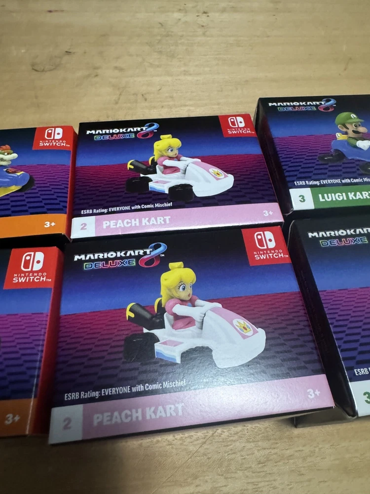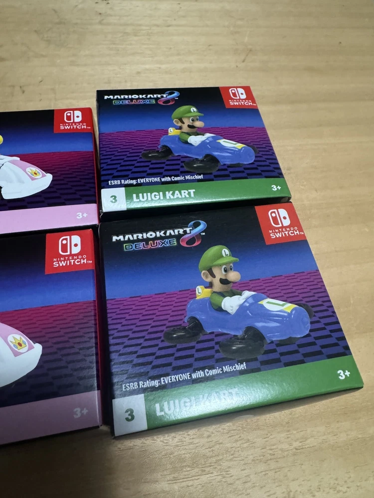 This is a special toy set featuring characters from the popular Mario Kart franchise. The set includes toys of various characters, including Luigi, peach and bowser. These toys are part of the McDonald's Happy Meal line and were released in 2024. They are suitable for children ages 3-11 and were manufactured in China. The set is a great addition to any Mario Kart collection and is sure to bring joy to any young fan.