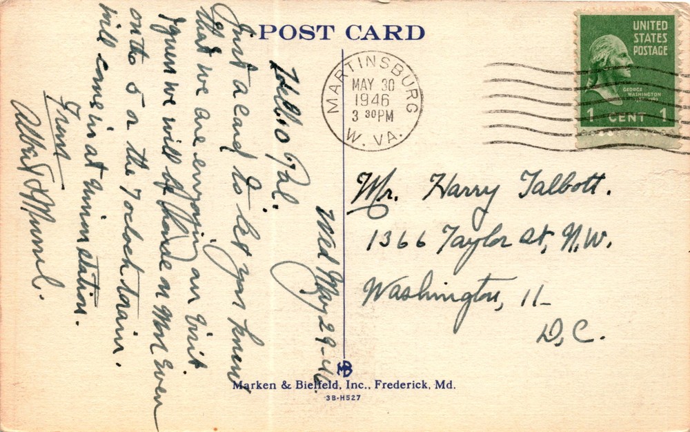 MAKE AN OFFER. THE MORE YOU BUY THE BETTER DEAL I WILL ACCEPT The postcard is a picture of the Federal Court and Post Office in Martinsburg, West Virginia. It is addressed to Mr. Harry Talbott in Washington, D.C. The postmark on the card is from May 30, 1946, at 3:30 PM in Martinsburg, West Virginia.