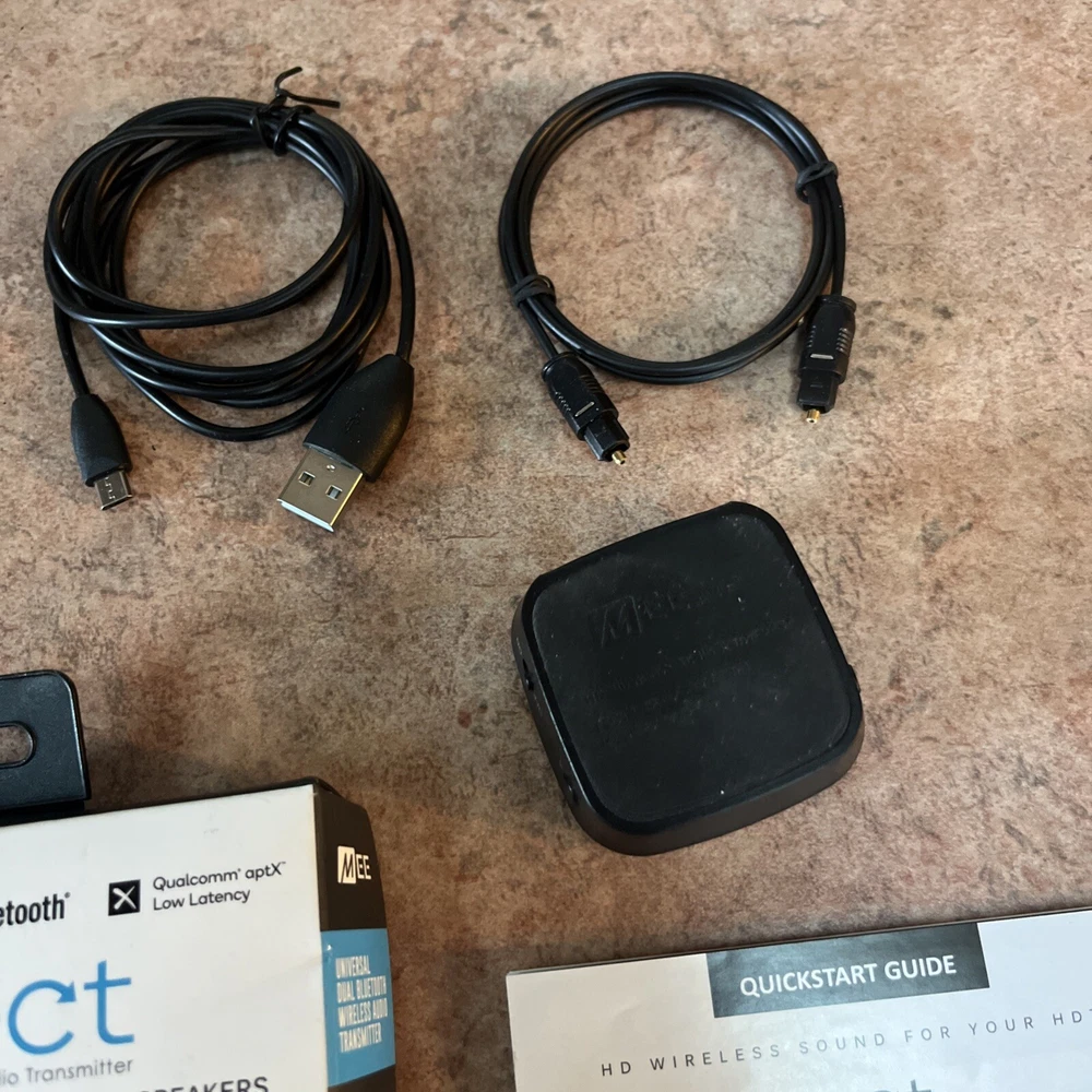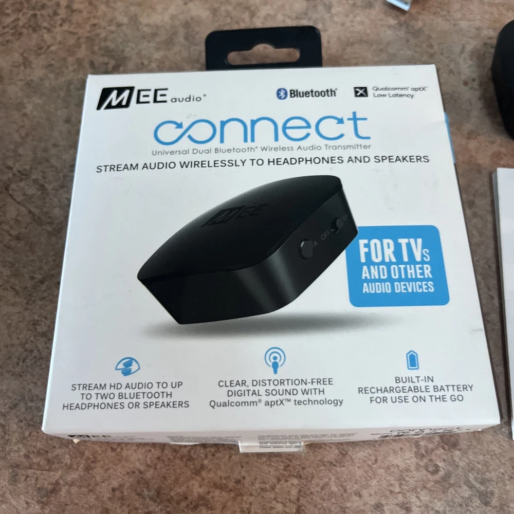 The MEE Connect Universal Bluetooth Wireless Audio Transmitter is a black device with 3.5mm audio input connection. It supports AM/FM bands and has both wired and Bluetooth wireless output connections. It has two audio inputs - digital audio optical TOSLINK and 3.5mm. This Bluetooth audio transmitter weighs 4 oz and is designed for Bluetooth wireless connectivity, with a USB 2.0 power source. It comes with a 1-year manufacturer warranty.