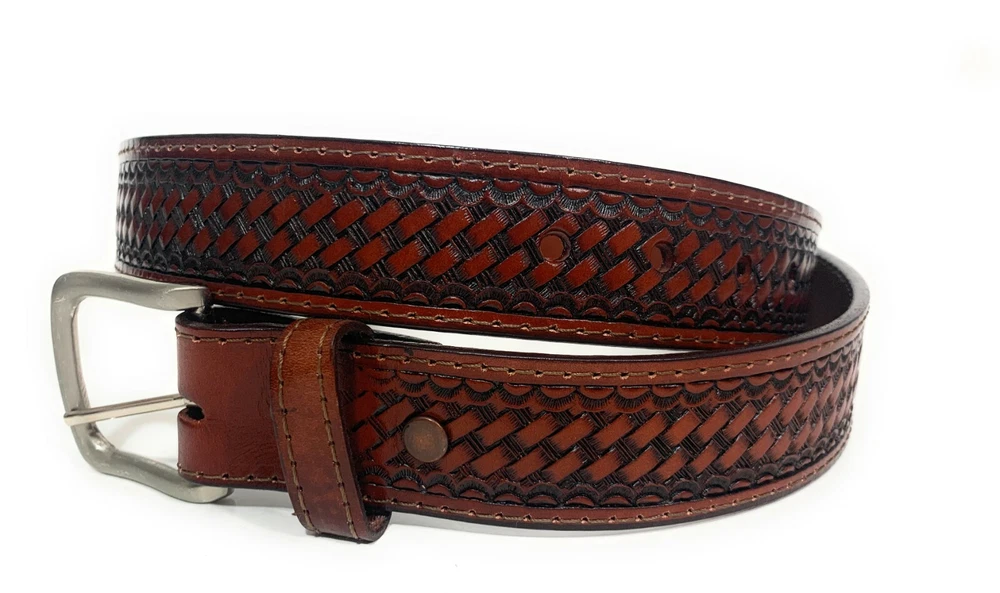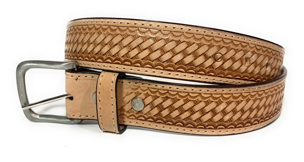 THIS IS A BEAUTIFUL HEAVY DUTY BASKET WEAVE LEATHER BELT. 1 1/2 inch WIDE WORK OR CASUAL BELT. GOES PERFECT WITH YOUR JEANS. BUCKLE IS REMOVABLE. SIZE IS TO THE CENTER NOTCH.... FOR EXAMPLE A SIZE 36 IS 36 INCHES TO THE CENTER NOTCH. To accurately order a belt please measure your old belt to the notch you use it on (don’t include the buckle). For example, if it measures 36 inches to the notch you use it on go with a size 36. Belt size in average is 2 sizes larger then your pants size.....for example if you use a size 36 pants you would need a size 40 belt.