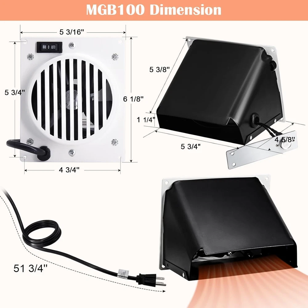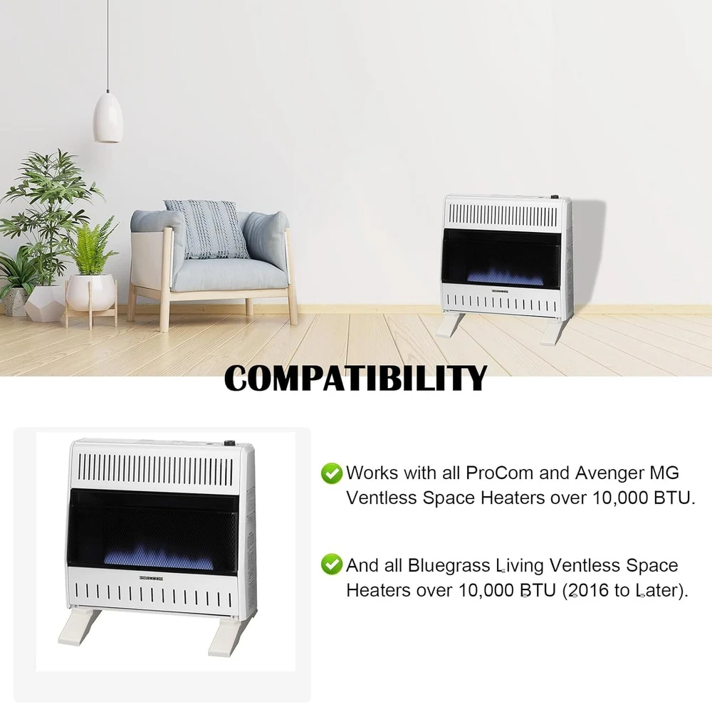 Fan Blower For Avenger Space Heaters - Model MGB100 Highlights: Material: Metal Built In Timer Oxygen Level Control Heat Output: 10000 BTU Automatic Delay Shutoff can be used indoors and outdoors Works with all ProCom and Avenger MG Ventless Space Heaters over 10,000 BTU. And all Bluegrass Living Ventless Space Heaters over 10,000 BTU (2016 to Later).