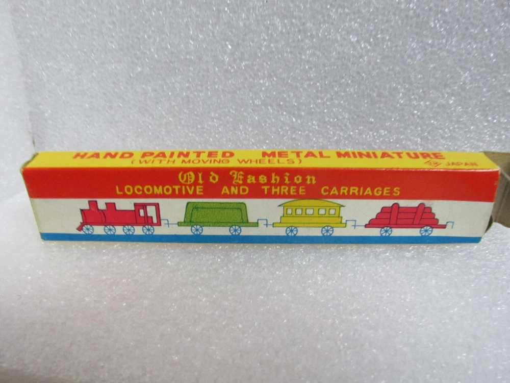 This listing is for a vintage box containing 4 miniature old fashion train pieces with moving wheels. They are in the original box. The only time they were taken out is when I took the picture. box measures 5 x 1 x 1/2" 110324-2 Please see all of the other, items that I have listed Please write if you have any questions and thanks for looking. .