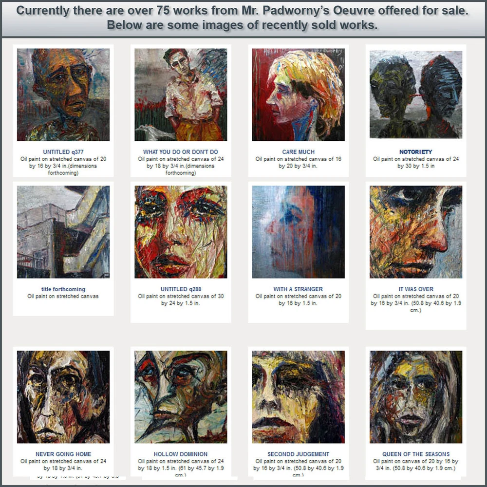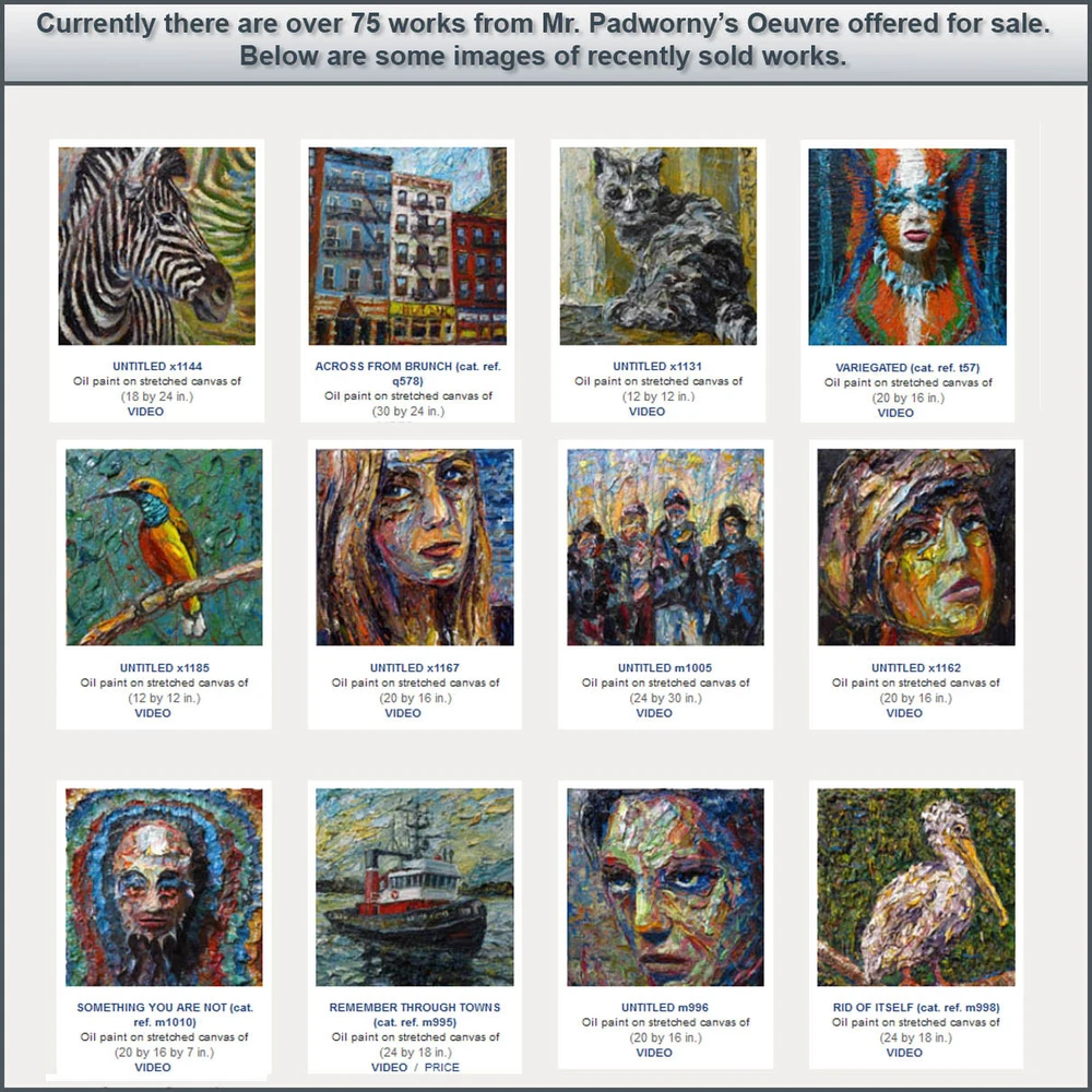 x1452 UNTITLED x1452 2024 O il Paint on Gallery Wrapped Stretched Canvas 16 by 12 by 3/4 in. [Please allow me a few days to package and ship these oil paintings -- thank you!] Painted in new NYC studio on West 15th Street. signed and dated on back of canvas, signed on front Note: I am very happy to entertain all offers on paintings. Every offer received is always considered a compliment. - DP Note: I am very happy to entertain all offers on paintings. Every offer received is always considered a compliment. - DP S C R O L L D O W N T O V I E W M O R E D E T A I L I M A G E S To sign up for the weekly newsletter of new auctions and paintings in the eBay store CLICK HERE Title and Provenance This painting is entitled UNTITLED x1452 , and includes the original signature of artist on front of painting and verso, with painting catalogue series and number applied on verso. Painting also includes a Certificate of Authenticity documenting chain of title and provenance for this work. Painting number x1452 may be included in forthcoming Catalogue Raisonné of the works of DAVID PADW0RNY. Medium and Dimensions Oil Paint on canvas of 16 by 12 by 3/4 in. , including hanging clip. This painting is pre-stretched and sides of the canvas are painted (see images below). Each of the sides are painted differently, to read more about why each is painted in a unique manner please click here . The staples holding the canvas to the stretcher bars are on the back so the painting is ready for immediate display. Shipping notes: We are pleased to combine shipping. If you intend to buy/bid on additional works, please send email to let us know your preferences. If you would prefer overnight or expedited shipping we will be happy to accommodate your wishes - please email for a specific bid. If you wish to combine shipping -- please request that the future invoices be changed to reflect combined shipping. For more details on combined shipping please visit these links based on your location: United States , Canada , all other International . Payment: PayPal is preferred. Paintings will ship upon bank clearing your funds. Please make payment within 5 days of sale. If there are special circumstances that might prevent this -- please email prior to sale. Thank you. Guarantee: If for any reason the actual painting does not meet your full expectations, please return it upon receiving it in its original condition and packaging materials. We will refund the full cost of the painting, less shipping costs. Additional Images and Materials (All links below will open in a new window) About The Artist DAVID PADW0RNY was born in Norristown Pennsylvania. He is a graduate of the Maryland Institute College of Art and is currently working full time as a professional artist in Chelsea, NYC. Awards and Honors Scholastics Portfolio Award, New York, New York Ed Lindgren Memorial Scholarship, Sponsored by Artworks Orlando Orlando, Florida Fanny B. Thalheimer Scholarship, Maryland Institute College of Art Baltimore, Maryland First Place and Honorable Mention in Painting, Maitland Arts Festival Maitland, Florida Best of Show and First Place, "Enjoying Our Lakes" Photography Contest Windermere, Florida Three Gold Medals, Scholastics Competition, University of Central Florida Orlando, Florida Additional Paintings Offered other ebay auctions (opens in a new window) Collector Comments Please feel free to email your opinions and comments of the paintings. We look forward to hearing more from you, our Valued Collectors, Gallerists and Curators. -- D.P.
