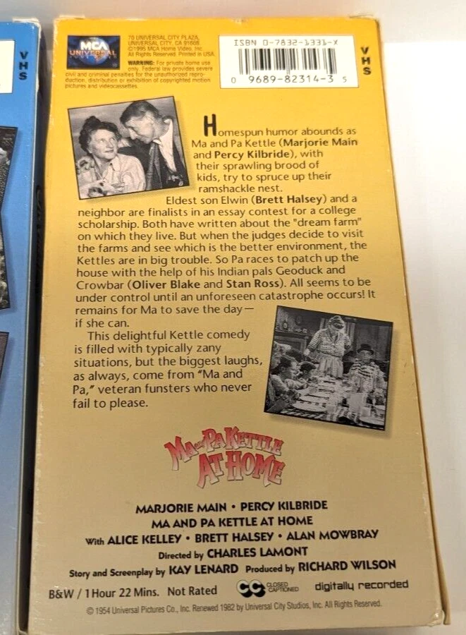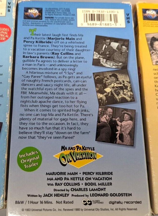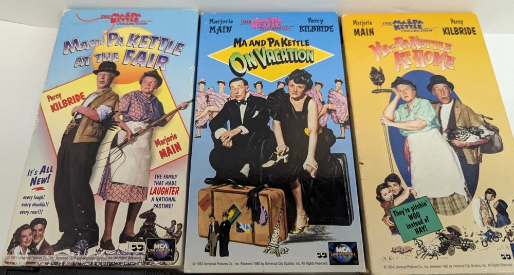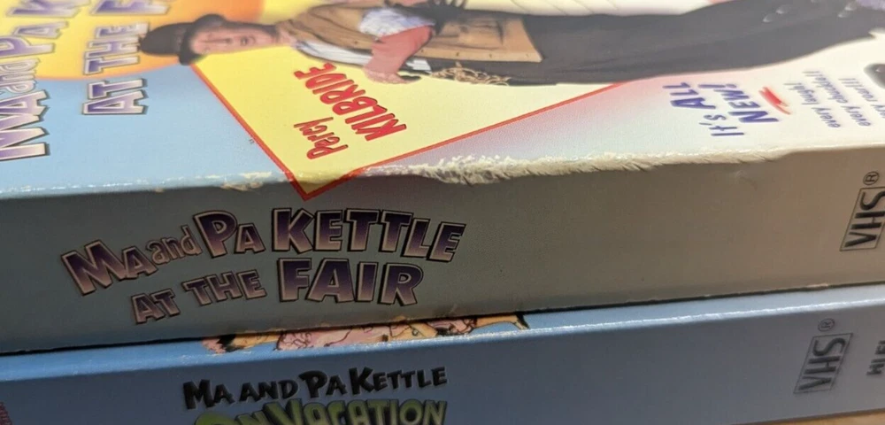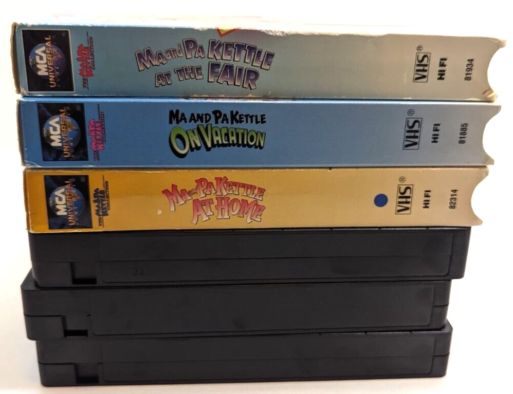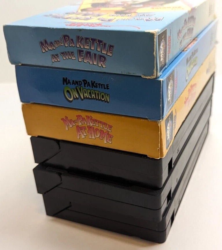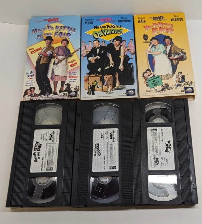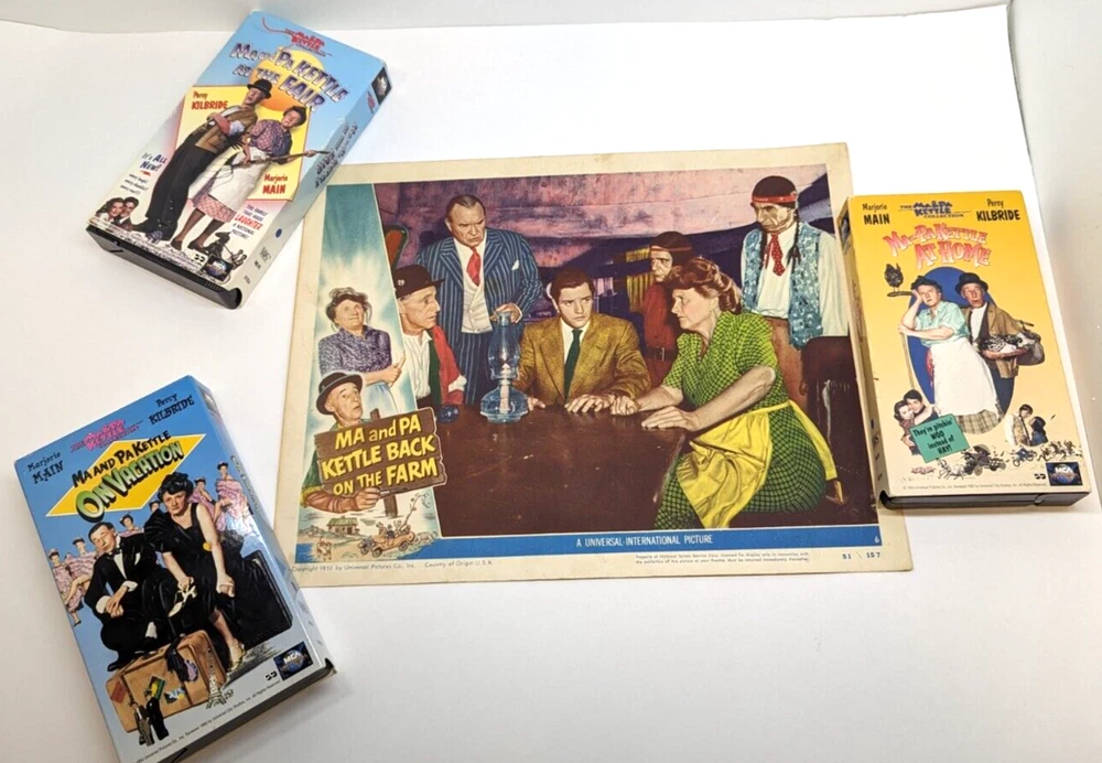 Ma And Pa Kettle Back On The Farm 1951 Poster & B/W VHS Tape Movie Lot Poster is about 14" x 11" VHS Tapes: -At The Fair -On Vacation -At Home Black & White films **See pictures. There may be some dirty spots, scuffs, creases, wear, etc. I tested each VHS tape for about 10 minutes and didnt notice any issues. Although the VHS tapes may have some issues while playing which is common with VHS tapes because of age. No smoke smell.** Ships from the USA! Feel free to message me with any questions. Thanks for shopping!