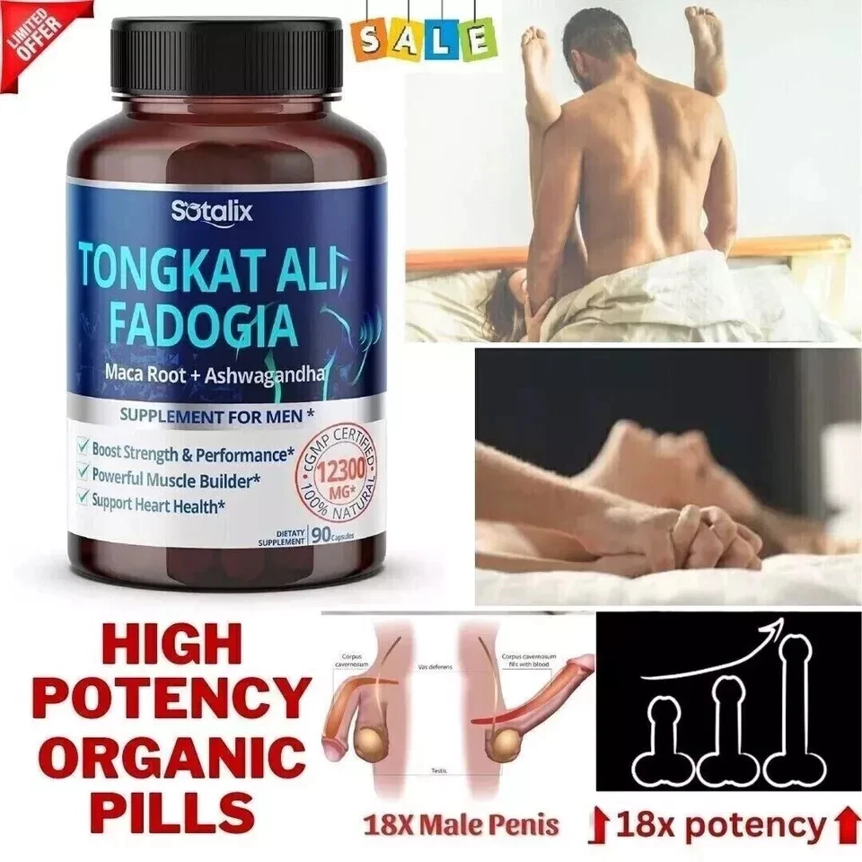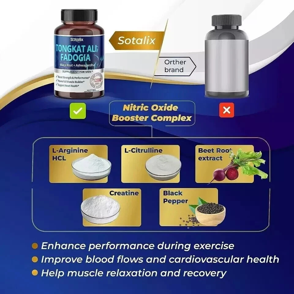 Premium Tongkat Ali 200:1 Extract (Longjack) 4780mg Ultra Potency with Maca Root Ginseng Tribulus Terrestris Ashwagandha - High Strength For Men Women-90 day supply (90 Count (Pack of 1)) About this item 💥 UNLOCK YOUR FULL POTENTIAL: Each of these capsules is packed with 4780mg of concentrated herbal powder to ensure maximum performance. Taking one capsule of Tongkat Ali supplements every day will increase your energy level naturally, balance the immune system, improve muscle strength, and promote restful sleep. It's perfect when combined with a daily workout, the positive changes in your body will become apparent - increased strength, improved health, and enhanced durability. 💥 HIGH CONTENT INGREDIENT: Sotalix Tongkat Ali contains a super-concentrated 200:1 Tongkat Ali (Longjack) extract, which offers superior nutritional value and maximum advantages for your overall health. Other brands are just using fresh Tongkat Ali powder or less than 10:1 extract. So, it’s 20X MORE EFFECTIVE than other Tongkat Ali products. 💥 UNIQUE COMBINATION - 6IN1: The Sotalix Tongkat Ali Supplement offers a distinctive blend of 6 top-quality ingredients in every capsule that brings better efficiency for you. Tongkat Ali, Maca Root and Panax Ginseng have powerful effects in supporting muscle growth and increasing workout performance. Meanwhile, the combination of Tribulus Terrestris, Horny Goat Weed, and Ashwagandha works to boost energy levels and promote intensity. 💥 100% NATURAL EXTRACT - SAFE AND EFFECTIVE: Sotalix Tongkat Ali has been tested by 3rd-party labs. It contains only pure vegetarian ingredients and is completely free of harmful chemicals. If you follow a vegetarian diet, our supplement is the perfect option for you. So you can safely use it without having to worry about the origin of the product. 💥 ENSURING YOUR SATISFACTION: We take pride in producing only the highest quality supplements. Your gratification and health are our top priority, which is why all of our products are created in a GMP-certified facility. And before being put on the market, our products have undergone multiple rigorous tests by ISO 17025 accredited labs. Feel results or all your money back no questions asked.