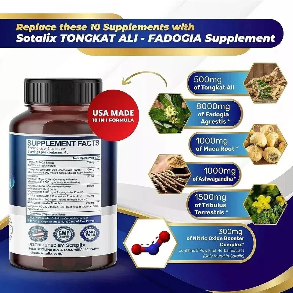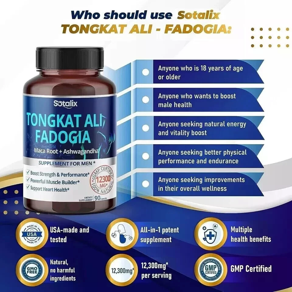 Premium Tongkat Ali 200:1 Extract (Longjack) 4780mg Ultra Potency with Maca Root Ginseng Tribulus Terrestris Ashwagandha - High Strength For Men Women-90 day supply (90 Count (Pack of 1)) About this item 💥 UNLOCK YOUR FULL POTENTIAL: Each of these capsules is packed with 4780mg of concentrated herbal powder to ensure maximum performance. Taking one capsule of Tongkat Ali supplements every day will increase your energy level naturally, balance the immune system, improve muscle strength, and promote restful sleep. It's perfect when combined with a daily workout, the positive changes in your body will become apparent - increased strength, improved health, and enhanced durability. 💥 HIGH CONTENT INGREDIENT: Sotalix Tongkat Ali contains a super-concentrated 200:1 Tongkat Ali (Longjack) extract, which offers superior nutritional value and maximum advantages for your overall health. Other brands are just using fresh Tongkat Ali powder or less than 10:1 extract. So, it’s 20X MORE EFFECTIVE than other Tongkat Ali products. 💥 UNIQUE COMBINATION - 6IN1: The Sotalix Tongkat Ali Supplement offers a distinctive blend of 6 top-quality ingredients in every capsule that brings better efficiency for you. Tongkat Ali, Maca Root and Panax Ginseng have powerful effects in supporting muscle growth and increasing workout performance. Meanwhile, the combination of Tribulus Terrestris, Horny Goat Weed, and Ashwagandha works to boost energy levels and promote intensity. 💥 100% NATURAL EXTRACT - SAFE AND EFFECTIVE: Sotalix Tongkat Ali has been tested by 3rd-party labs. It contains only pure vegetarian ingredients and is completely free of harmful chemicals. If you follow a vegetarian diet, our supplement is the perfect option for you. So you can safely use it without having to worry about the origin of the product. 💥 ENSURING YOUR SATISFACTION: We take pride in producing only the highest quality supplements. Your gratification and health are our top priority, which is why all of our products are created in a GMP-certified facility. And before being put on the market, our products have undergone multiple rigorous tests by ISO 17025 accredited labs. Feel results or all your money back no questions asked.
