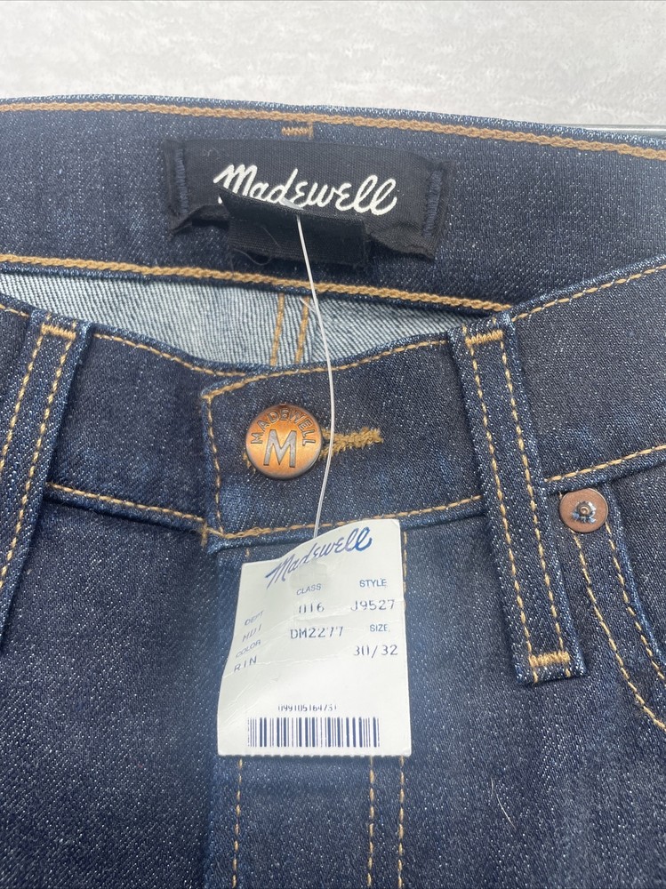 Elevate your denim game with these Madewell by J. Crew Men's Slim Denim Jeans. The dark wash cotton blend fabric exudes a classic American style that never goes out of fashion. The selvage fabric type adds a touch of sophistication to the jeans, making it a perfect fit for any occasion. Featuring a mid-rise waist and straight leg style, these jeans are slimming and comfortable. The zip closure provides a secure fit, and the 32-inch inseam ensures it fits perfectly on a size 30 waist. These jeans are perfect for any fashion-forward man who wants to make a statement with his style.