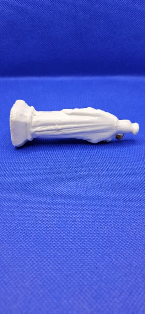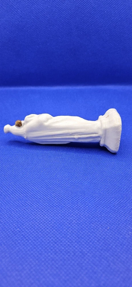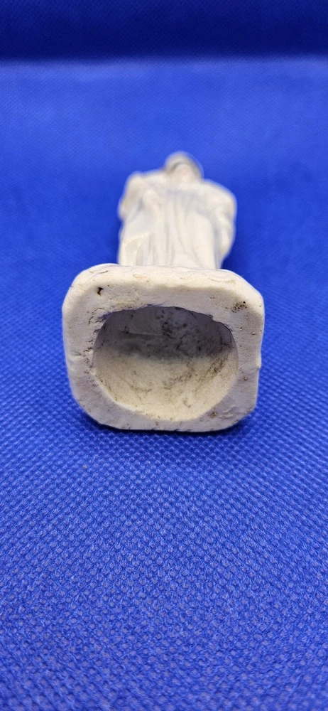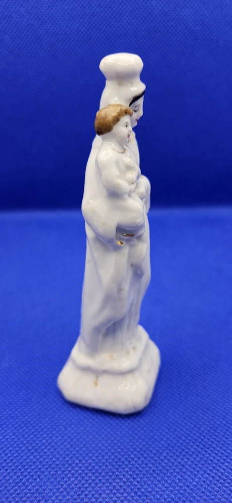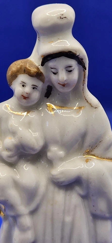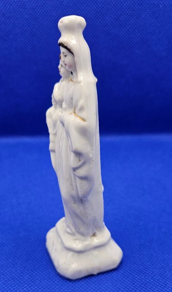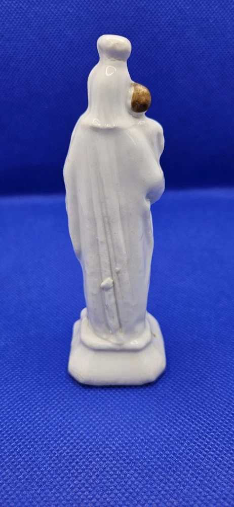 Hand press molded earthenware Madonna and Child Figurine White 4.5" Staffordshire Mantilla on head Faces and hair painted Gold accents Cross molded on base No mark No chips, cracks, or crazing