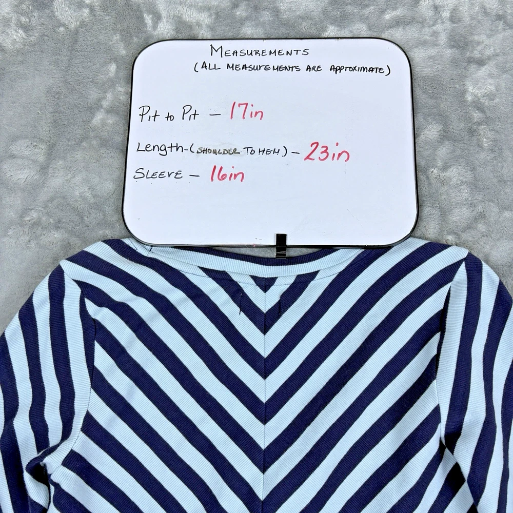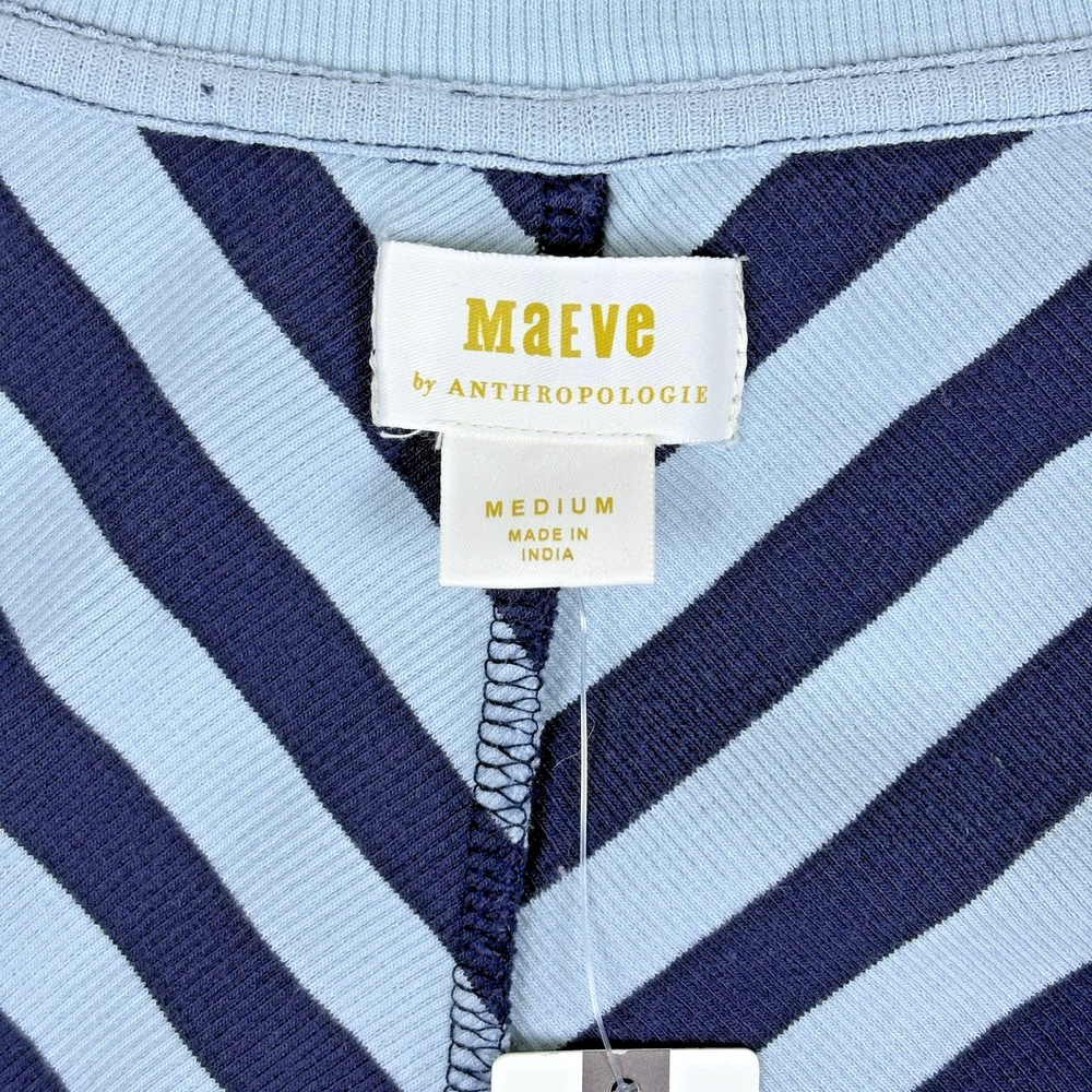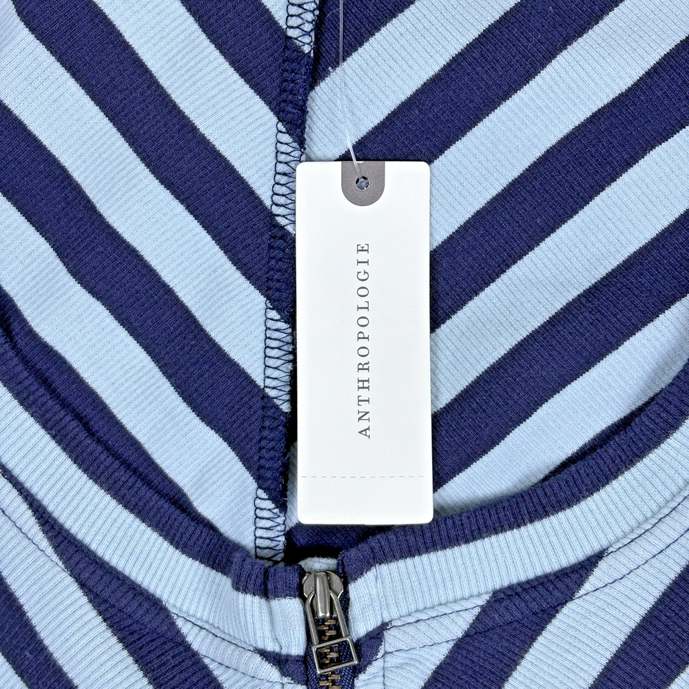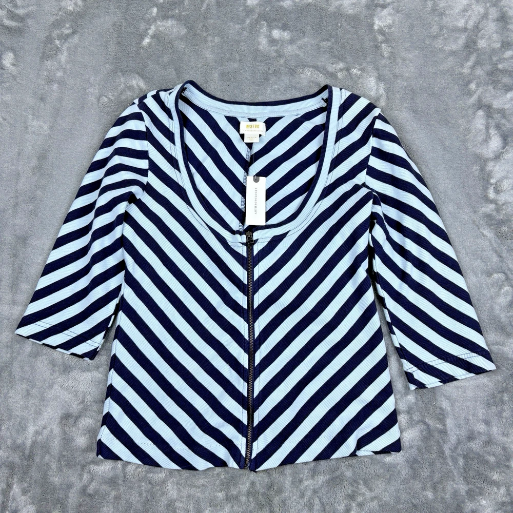 A crisp nautical aesthetic defines this Maeve by Anthropologie knit, with bold chevron striping and a front zip that gives it a modern, polished edge. Structured knit fabric offers comfortable stretch with a flattering shape Chevron stripe pattern creates visual slimming and directional interest Front zip neckline allows adjustable styling from casual to refined Three quarter sleeves balance coverage with an easy everyday wear feel Pairs effortlessly with white denim, tailored trousers, or a casual skirt New With Tags – Fabric retains original structure and finish throughout. Color may vary slightly due to lighting. Pit to pit flat 17 in Length shoulder to hem 23 in Sleeve 16 in All measurements are approximate and may differ slightly than tags. See photos. NoDealLeftBehind is proud to offer this piece. Questions always welcome. Follow NoDealLeftBehind for new finds and fresh listings added regularly. #nauticaltop #anthropologiestyle #chevrontop #zipfronttop #modernclassic nautical,preppy,modern Maeve Anthropologie zip front knit top chevron stripe womens medium nautical style