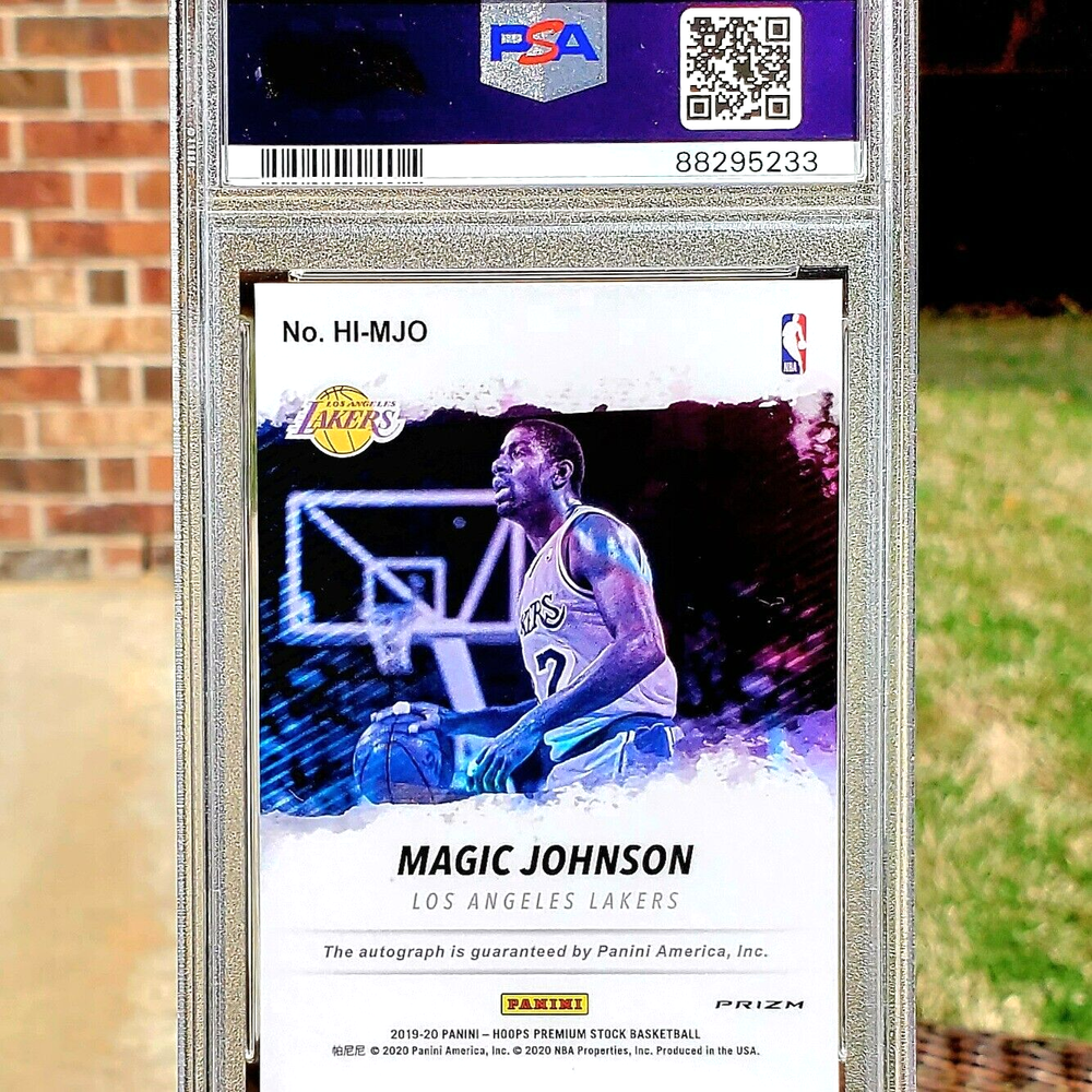Magic Johnson - 2019 Hoops Premium - Hoops Ink Autographs Flash Prizm - PSA 10 (Gem Mint) Low POP (POP 17 at the time of this posting) This is a rare and highly sought-after Magic Johnson 2019 Hoops Premium - Hoops Ink Autographs Flash trading card. It features a label or sticker autograph and a Flash Prizm parallel/variety. This card is graded PSA 10 and is a low POP (population) with only 17 in existence. It also includes other features such as being an NBA Champion, NBA Legend, Hall of Famer, and part of the Hoops Ink insert set. This original sports trading card is made of card stock material and is a standard card size with a thickness of 35 Pt. It is an excellent addition to any sports trading card collection.