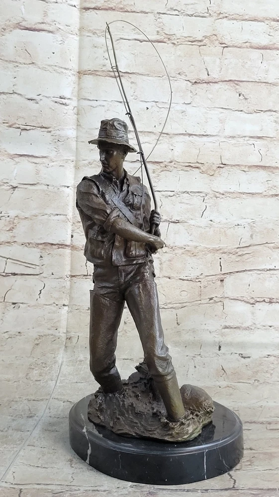 Condition : This sculpture is in perfect condition. Bronze Dimensions with Marble Base: Height 16" X Width 8" Marble Dimensions: Diameter 8" Height without base:15" Weight:10 LBS Inventory:27X24684972 Witness the struggle for survival captured in exquisite bronze artistry with this poignant sculpture. Depicting a man's determination as he fishes with a simple stick, this artwork portrays the resilience of human spirit in the face of adversity. The man's attire, complete with a protective hat and a small bag, underscores his resourcefulness and his battle against the elements while navigating the challenging river. Crafted using the age-old method of lost-wax casting, this sculpture embodies the artist's commitment to preserving the intricate details of the scene. The brown patina finish not only enhances the sculpture's aesthetic appeal but also adds a touch of timelessness to the narrative it conveys. Resting on a sturdy black marble base, this artwork stands as a testament to human fortitude and the enduring power of art to capture the essence of human experience. Signed by the artist Thomas, this bronze sculpture invites viewers to contemplate the struggles and triumphs that define our existence. Whether displayed in a collection or as a standalone piece, it serves as a reminder of the resilience within us all and the stories that art can uniquely convey. Signed Original English Thomas Fisherman Fish Bronze Sculpture Statue Figurine www.bronzhaus.com Video will open in a new window Using the eBay App? Paste link into a browser window: [isdntekvideo]