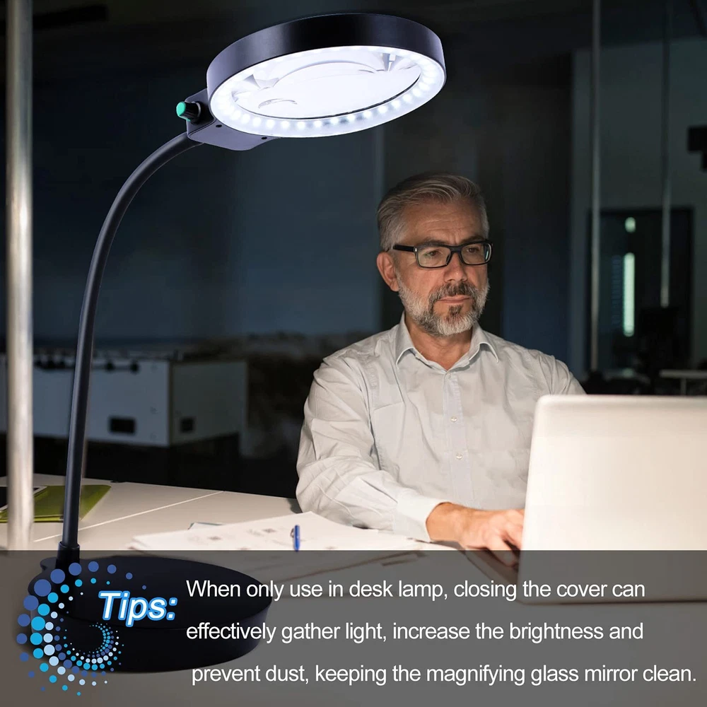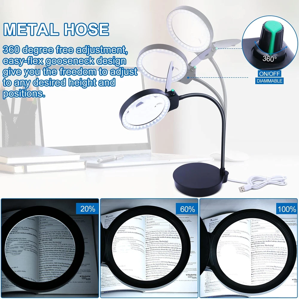 [10X & 20X HD Magnifying Lens] This magnifier glass features powerful 10X and 20X HD glass lenses with anti-glare reflector coverage for magnified and distorted vision.To do this, you need to adjust the height of the magnifying glass to a perfectly balanced position.Keep that in mind. [2 IN 1 Magnifying Glasses with Light for Close Work] You can either use it as an LED lamp, you also can attach it to your workbench as a magnifying lamp. It is a great light for whether working on tiny intricate mechanical systems, or for simply reading small print with ultra clarity. [ 0%-100% Lighted Reading Glasses ] The brightness level of the illuminated magnifier table lamp can be stepless adjusted between 0% to 100%. Can be used as webcam lighting, video conference lighting, zoom lighting for computer and also desk lamp. [ 360° Flexible Gooseneck ] The 360° flexible adjustable magnifying gooseneck reading light allows you to bend and twist to any place without any noise. You can work, read or study anywhere even in bed. [ Dust Prevention & USB Powered Design ] 5.3 inch magnifying glass lens with dust cover. Dust prevention & easy to clean. Plug the USB cable into any available USB port to power the LED, minus the trouble of finding a socket.