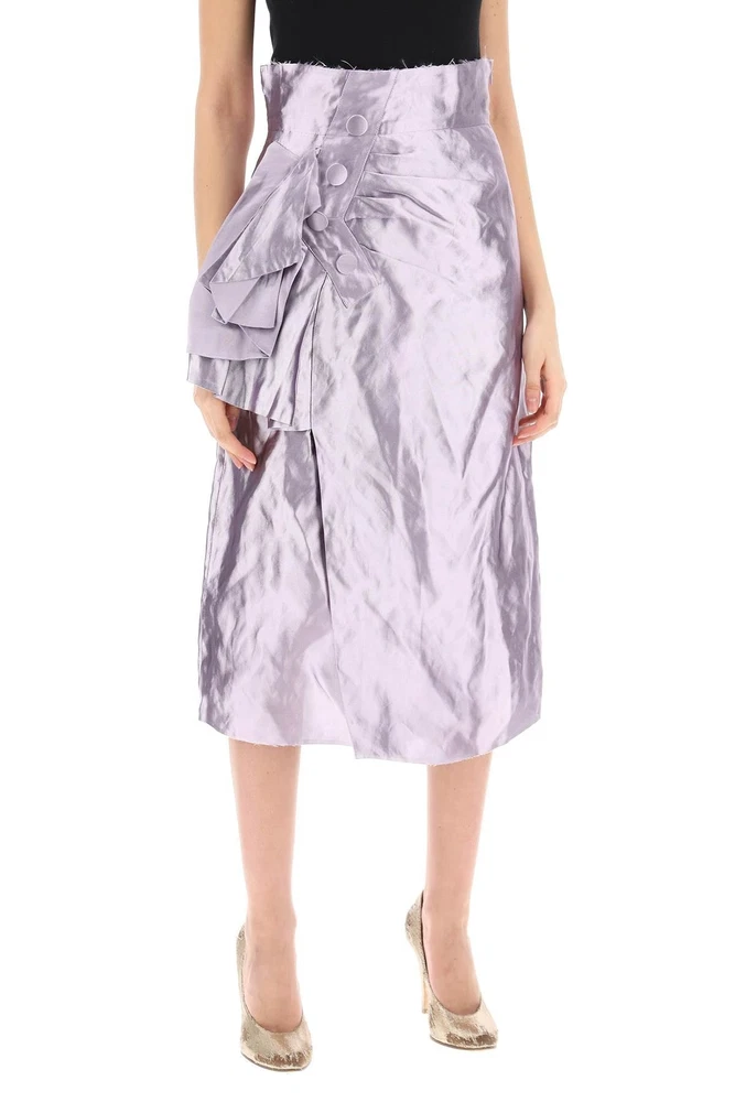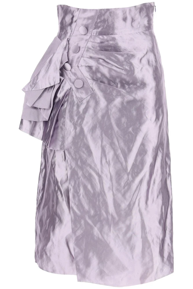 Maison Margiela wrap skirt made of metallic duchesse satin with a crinkled finish. The high-waisted straight cut is embellished with draped detailing and decorative buttons. Featuring a raw edge hem, it has a pocket on the right side and a side zip closure. Iconic 'Four Stitches' detail on the back. Model is 177 cm tall and wears size IT 40. Material: 42%PL 41%ME 12%SE Size Info: IT Color: Metallic Brand Code: S51ME0010 S78555 Season: 2024 Condition: Authentic, Brand New