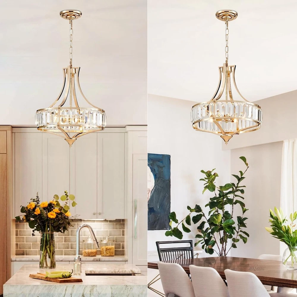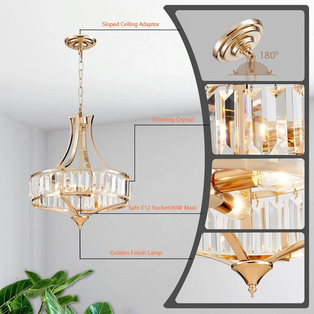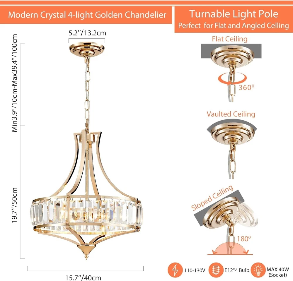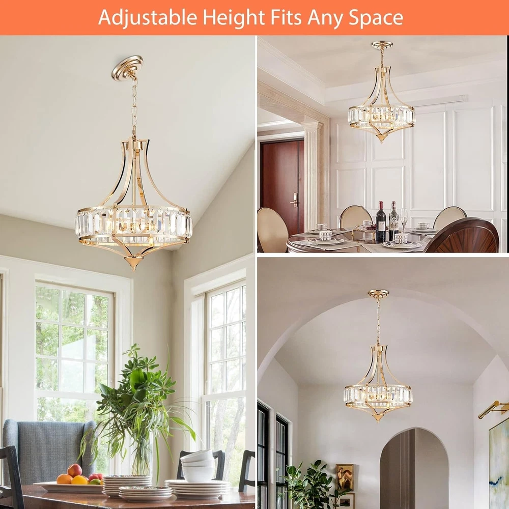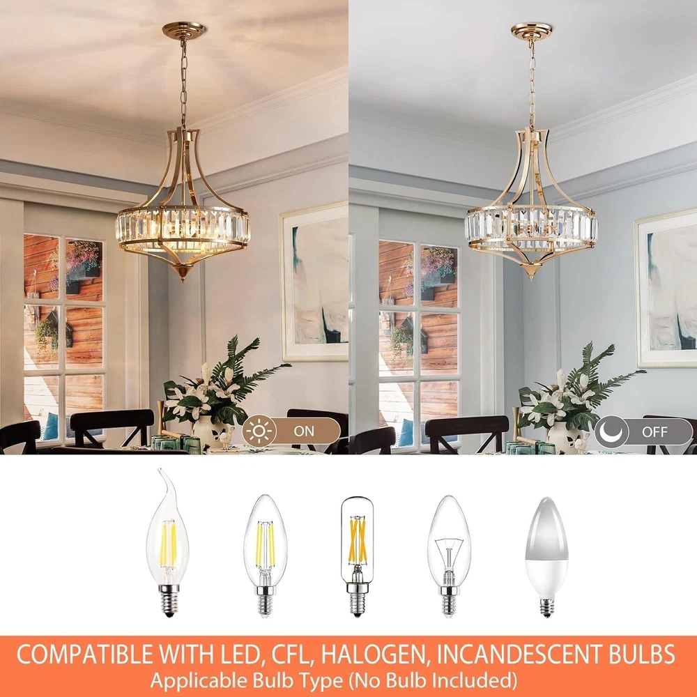 Seller Notes: The original box is damaged. About This Item: [Vintage Crystal Chandelier]: Add elegance to your space with our charming vintage crystal chandelier. Its rustic farmhouse pendant light design, combined with high-quality crystal material, creates an exquisite lighting centerpiece that enhances any room's ambiance. [Easy Installation and Safety]: Experience a hassle-free installation process with detailed instructions and helpful installation videos provided. Prioritize safety by remembering to disconnect the power before installation. [Kitchen Island Chandelier]: Illuminate your kitchen island with our perfectly sized chandelier measuring 40x40x50cm (15.7x15.7x19.7inches). It features 4 E12 lamp sockets compatible with LED, CFL, HALOGEN bulbs (maximum power of 40 watts per socket, bulbs not included). [Adjustable Height for Various Ceilings]: Our chandelier's adjustable length chain suspension design allows for easy hanging on any type of ceiling, whether flat, vaulted, or sloped (chain length 3.9"-39.4"). Ideal for dining rooms, living rooms, bedrooms, hallways, entrances, kitchens, and more, it adds sophistication to any space. Return Policy: Returns are accepted within 30 days of receiving your item. Return shipping cost is your (the buyer's) responsibility. The original shipping will not be refunded unless the item is different than described in the listing. If the item is returned in a different condition than originally sent, your refund might be reduced up to 50%.