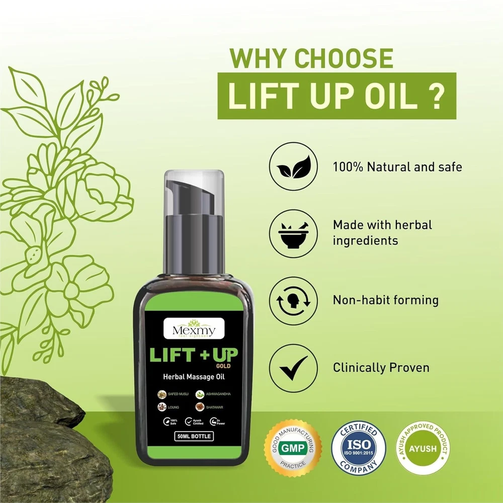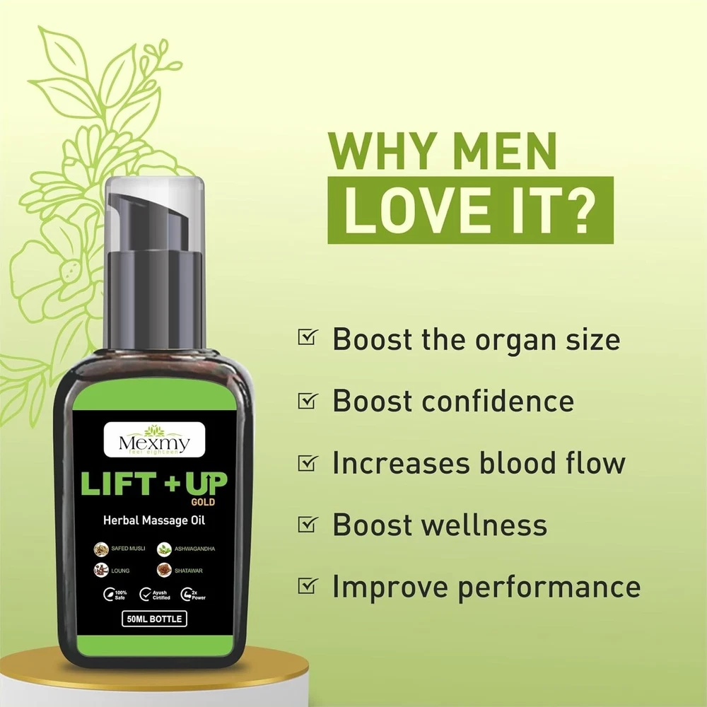MEXMY Feel Eighteen Lift-Up Massage Oil for Men - 50 ml Revitalize your body and mind with MEXMY Feel Eighteen Lift-Up Massage Oil, specially formulated for men seeking an invigorating and refreshing experience. This 100% pure and natural Ayurvedic oil is designed to enhance vitality and promote a sense of well-being. Key Features: 100% Pure and Natural : Crafted from high-quality botanical ingredients, ensuring you receive only the best for your body. Ayurvedic Formula : Blends traditional wisdom with modern care, providing holistic benefits that support overall health. Invigorating Lift-Up Effect : This unique formula helps uplift and energize, leaving you feeling revitalized and rejuvenated. Easy to Use : Ideal for daily massage, promoting relaxation while enhancing circulation and muscle recovery. Suggested Use: Massage a small amount onto the desired areas of your body. For best results, use regularly, especially after workouts or long days. Quality Assurance: MEXMY is committed to providing premium products, free from artificial additives and harmful chemicals. Enjoy the natural benefits of this Ayurvedic massage oil, designed to support your active lifestyle. Elevate your self-care routine with MEXMY Feel Eighteen Lift-Up Massage Oil, and experience the invigorating power of nature!