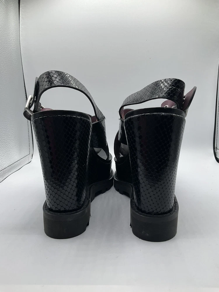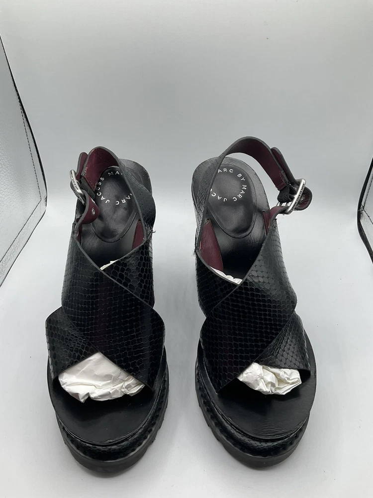 Elevate your shoe game with these stylish Marc By Marc Jacobs black patent leather wedges. With a snake look pattern and scalloped accents, these shoes are perfect for any occasion - from casual outings to cocktail parties. The adjustable ankle strap and buckle closure ensure a secure fit, while the 5 inch wedge heel provides a comfortable and trendy lift. These shoes are a must-have for any fashion-forward woman, and they come in a size 8. Made in Italy with high-quality materials, these shoes are built to last. Add a touch of designer flair to your wardrobe with these cute and stylish wedges.