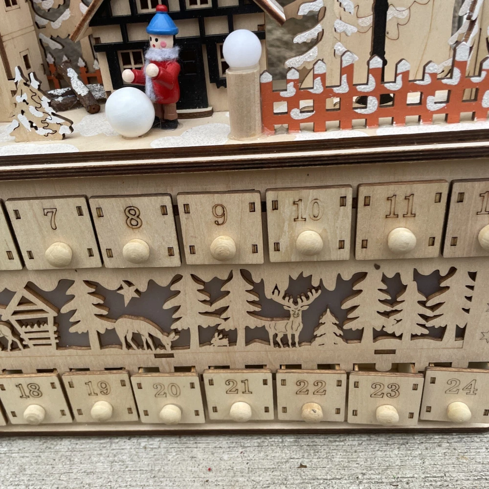 This festive Martha Steward Adventure calendar has led lights and has a lot going on. Please be aware and see pics as there are a few tree tips missing, otherwise a beautiful piece. The kidos will love it! Has led lights and takes 2?AA which are not included. You’ll love the details on this piece
