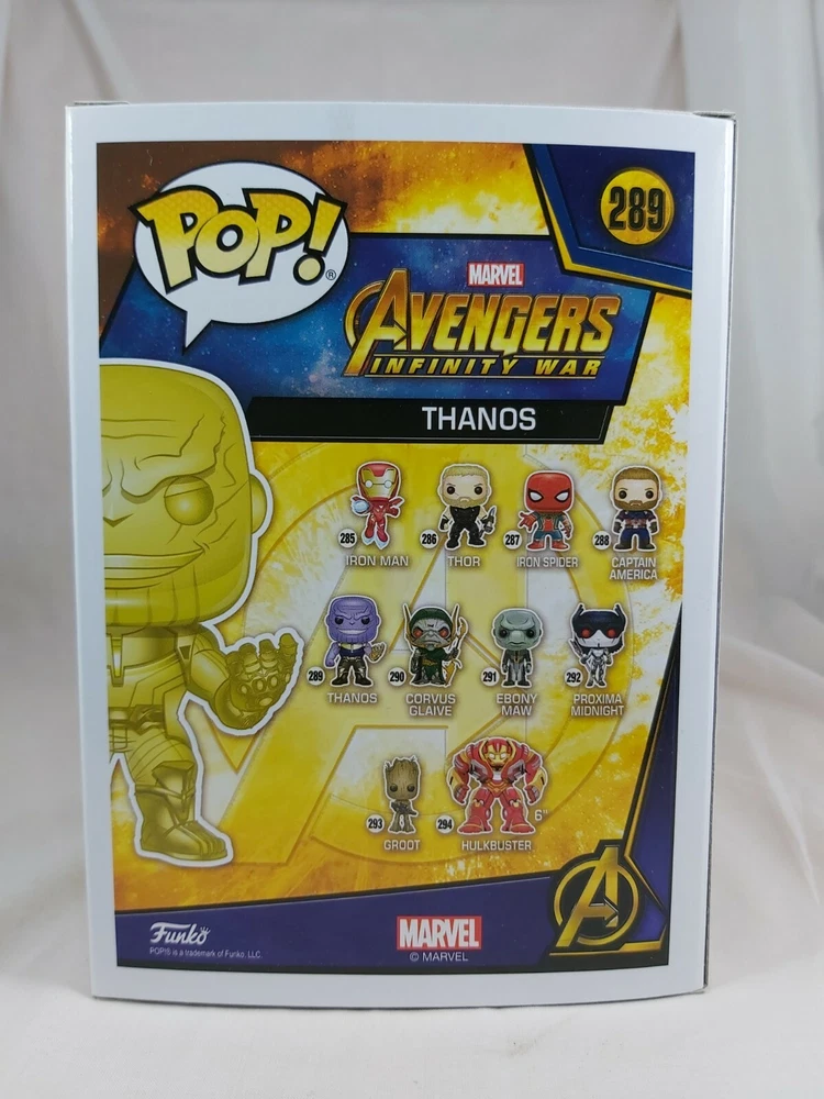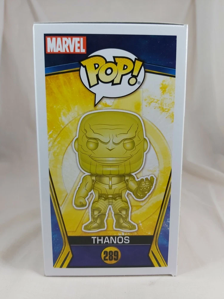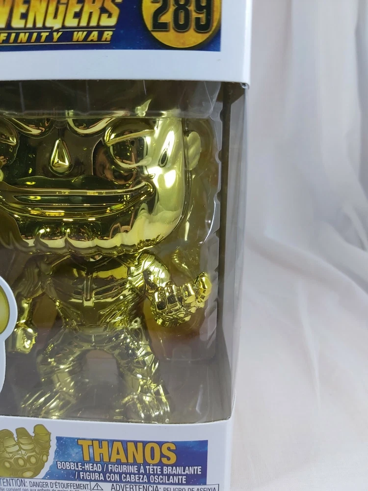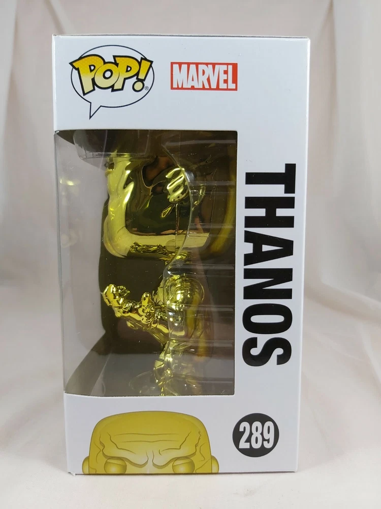 Up for sale is the Thanos (Yellow Chrome) pop from the Avengers Infinity War line. This pop is in good condition with some minor box issues. Please check the photos are they form part of the description. Will be sent in a soft pop protector International postage is taking at least 40 days to arrive. Please do not purchase if you are unable or unwilling to wait that long.