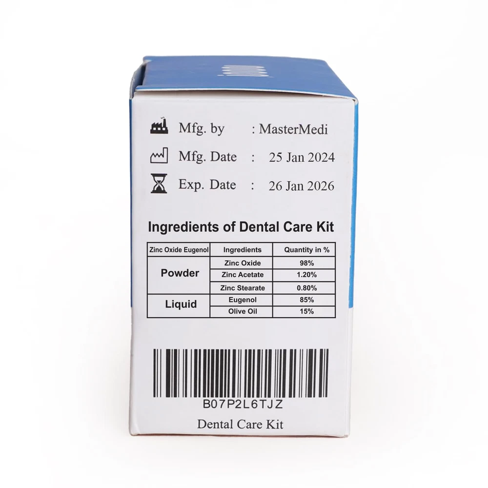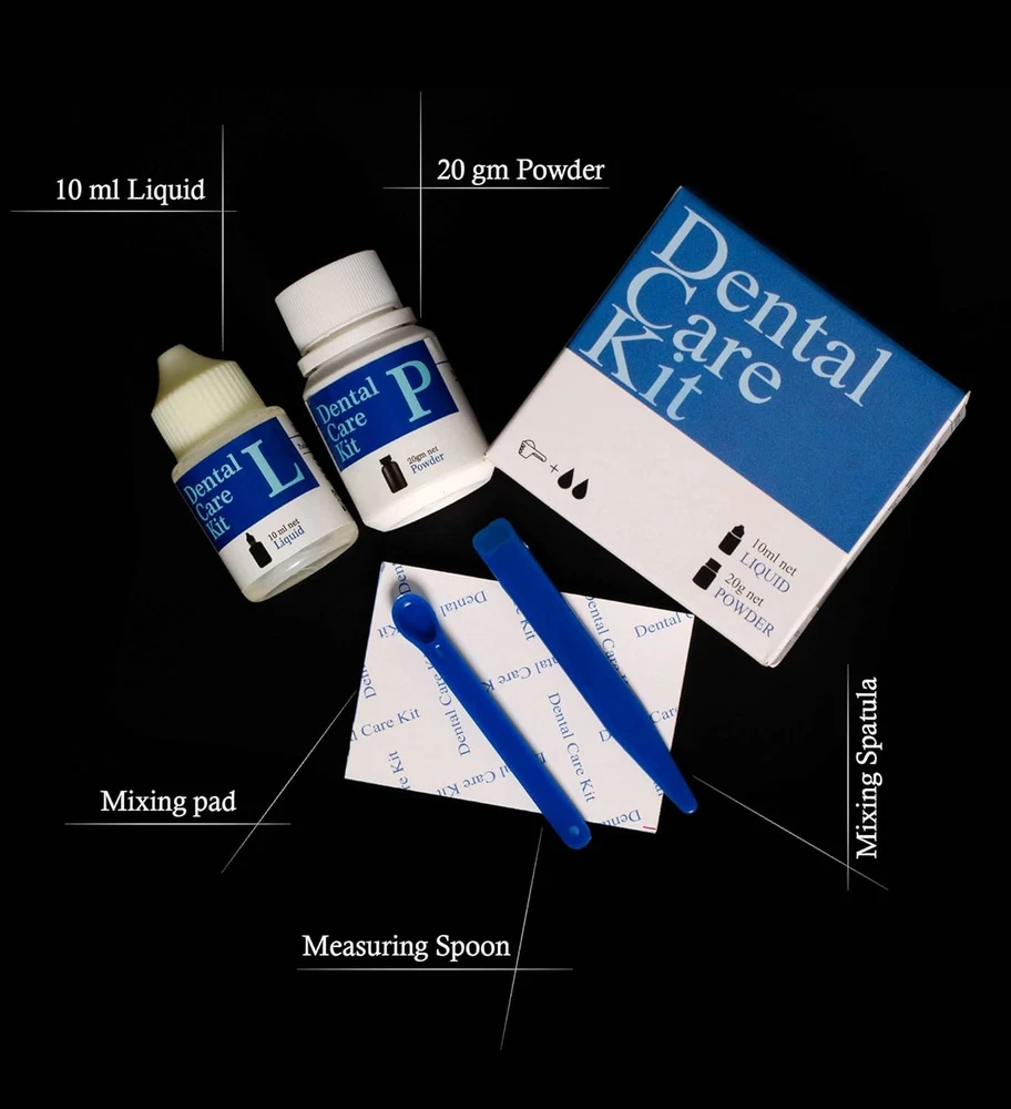 Tooth Filling Kit High Strength , Suitable for instant fillings, bridges & caps Self Curing, self adherent & Universal shade 20 gm Powder + 10 ml Liquid + Mixing pad + Measuring Spoon + Mixing Pad + Leaflet for instructions Dental Care Kit
