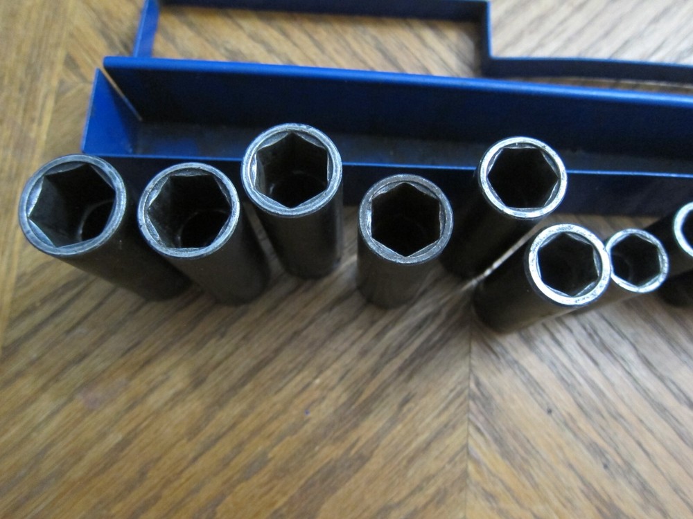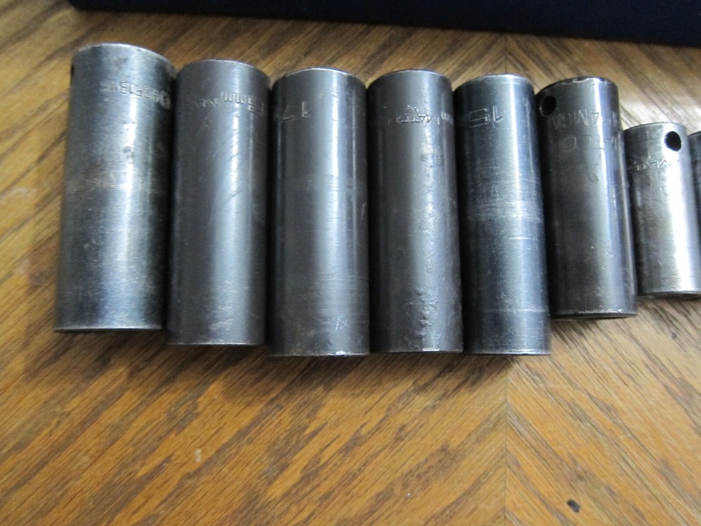 Matco 3/8 drive deep socket set with tray sizes are, 19mm, 18mm, 17mm, 16mm, 15mm, 14mm, 13mm, 12mm, 11mm, 10mm, 8mm, expect some wear corrosion usa shipping