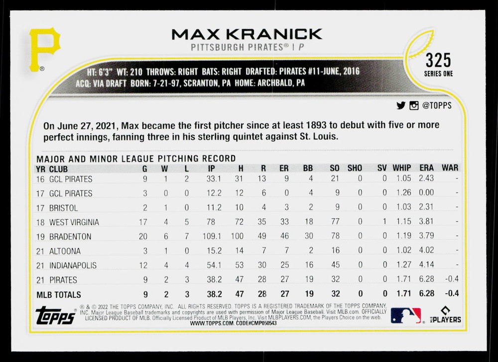 You will receive a , Max Kranick 2022 Topps #325 Pittsburgh Pirates Near Mint or Better condition. Please note i am not a professional card grader the condition of raw cards can be very subjective. Please refer to the high quality pictures to determine condition yourself any questions at all please feel free to ask!! we take pride in the quality of cards we sell and ship, all cards will be shipped in a penny sleeve and top loader for added protection. be sure to save us as a seller, as we are growing and listing daily THANK YOU FOR YOUR BUSINESS