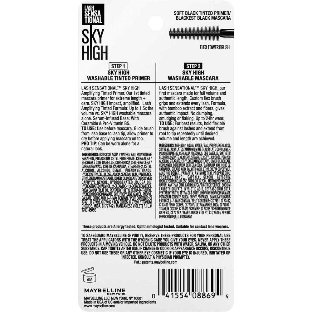 Amplify your lash game today with Maybelline Lash Sensational Sky High Mascara and Tinted Primer. This mascara delivers full volume and limitless length. Exclusive flex tower brush bends to volumize and extend every single lash from root to tip. Washable mascara formula infused with bamboo extract and fibers for long, full, and lightweight lashes that don't flake or smudge. The tinted primer for extreme length care. Amplifiy length, thickens and cares for lashes. When worn with mascara, 90% saw ultra-lengthened lashes. Up to 1.5x the volume vs. Sky High washable mascara alone. In a consumer test with their usual mascara. On Nov 10, 2024 at 19:57:25 PST, seller added the following information: