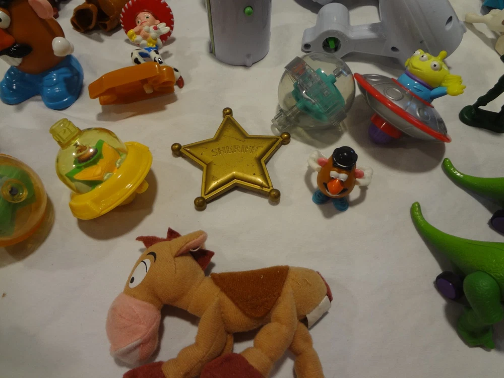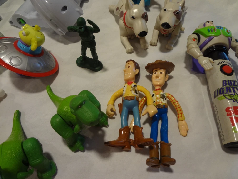 McDonalds Happy Meal Toy Story Toys Figures Lot . One of the books is still wrapped in plastic. The other book is empty. Mr. Potato with the french fries and without the french fries on his back swings his arm when you push the button on the back. both wind-up dogs work