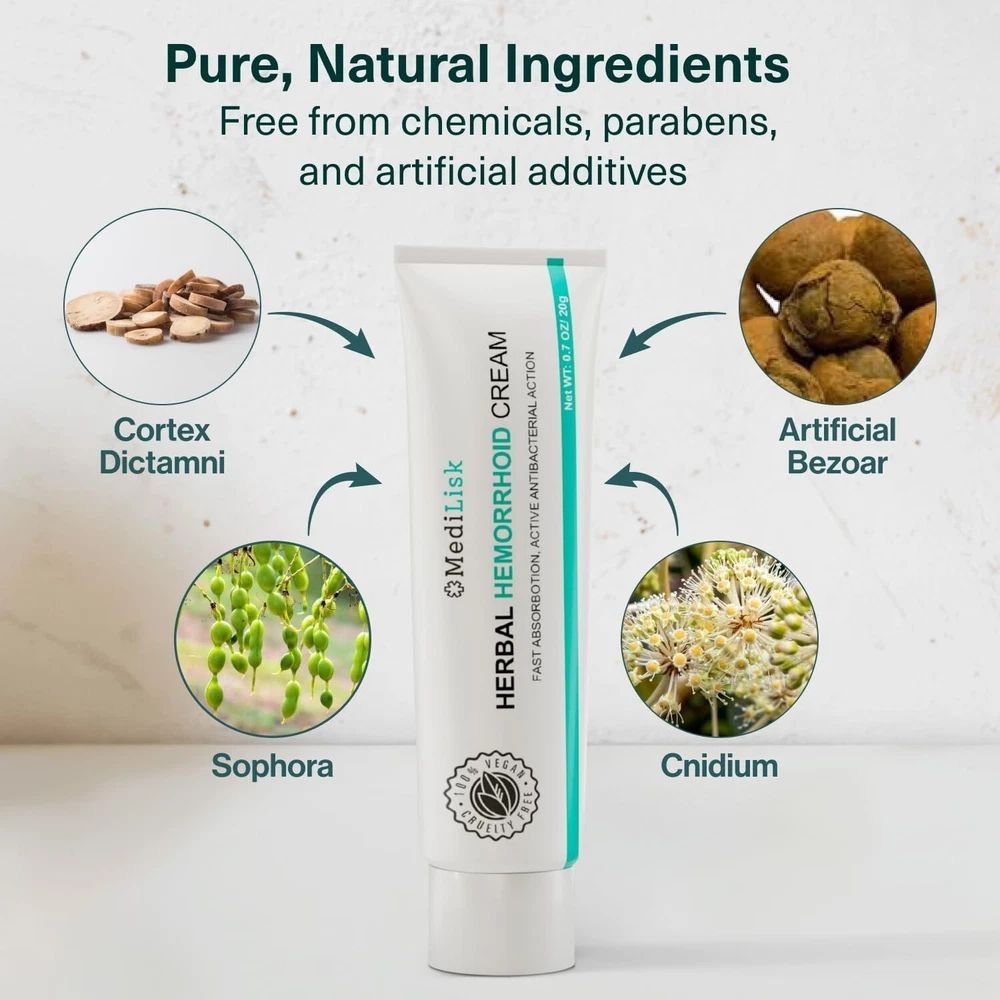 Experience the calming comfort of MediLisk Herbal Cream, formulated to provide temporary relief from pain, burning, itching, and discomfort associated with hemorrhoids. Our carefully crafted blend of natural ingredients works to soothe and alleviate symptoms, promoting a sense of well-being.