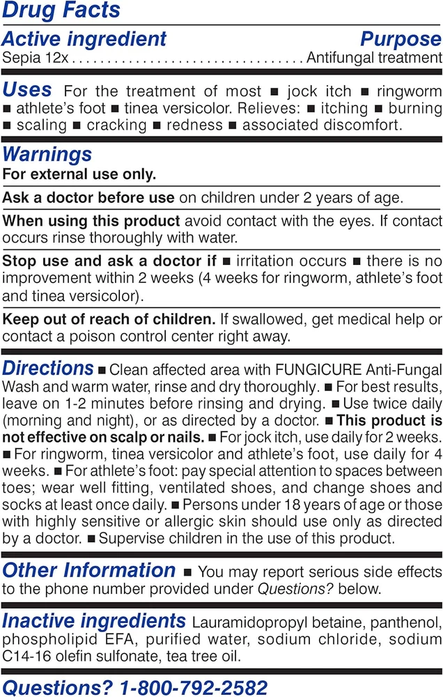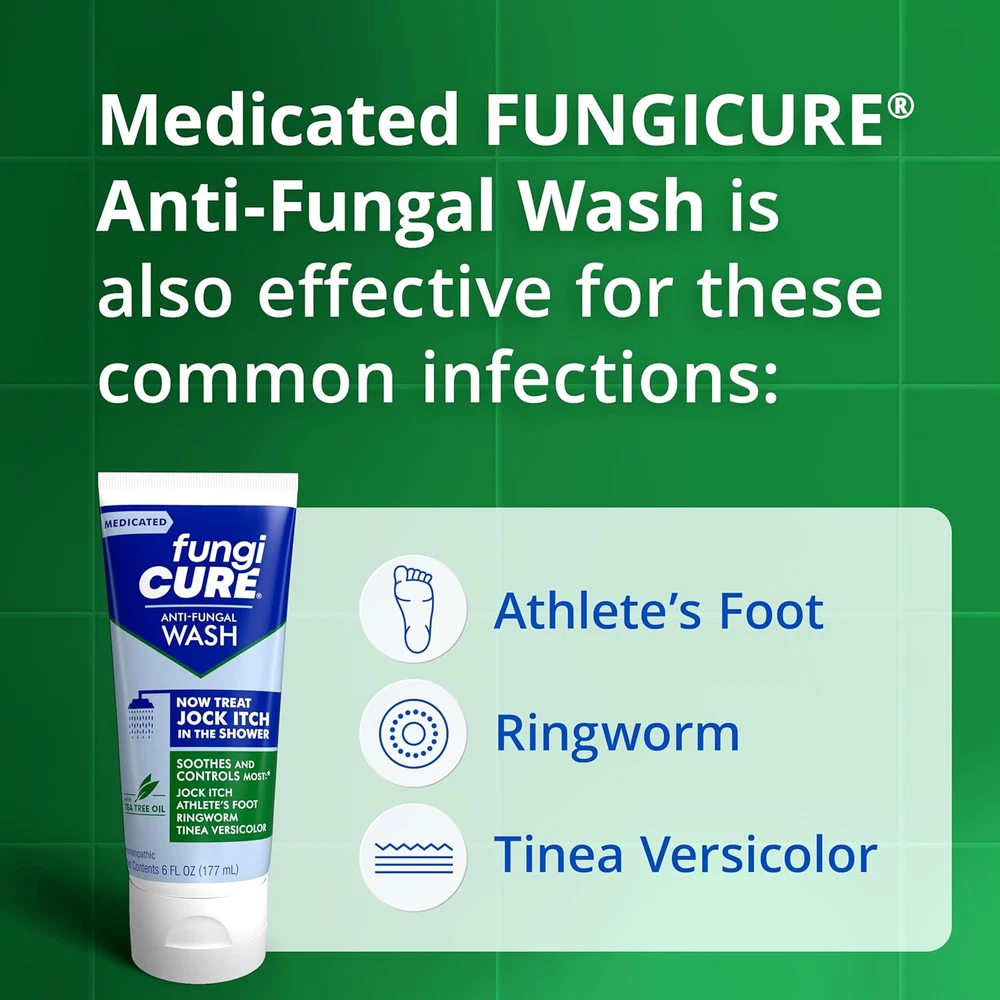 FUNGICURE Medicated Antifungal Wash provides convenient, effective treatment and relief right in the shower for most jock itch fungal infections FUNGICURE Medicated Antifungal Wash features the effective homeopathic antifungal ingredient Sepia 12x plus tea tree oil Wash the affected area with FUNGICURE Medicated Antifungal Wash as you normally would in the shower with any other body wash Regular use of FUNGICURE Medicated Antifungal Wash helps eliminate common fungus that can lead to jock itch FUNGICURE Medicated Antifungal Wash is also an effective treatment for most other common fungus infections like ringworm, athlete’s foot, and tinea versicolor It’s not you, it’s the fungus. Well, it’s you too, and you can trust medicated FungiCure Anti-Fungal Wash to conveniently treat most jock itch, ringworm, athlete’s foot, tinea versicolor and other common fungal infections of the body, hands, and feet while you shower. The itch happens. Thanks to FungiCure, it also goes away. Medicated FungiCure Anti-Fungal Wash lets you treat most jock itch conveniently in the shower without the mess and inconvenience of sprays, creams, and powders. Regular use of Medicated FungiCure Anti-Fungal Wash helps eliminate common fungus that can attach to healthy skin. Use it alone, or in combination with other treatments you’re currently using. Medicated FungiCure Anti-Fungal Wash controls most fungal skin infections including jock itch, ringworm, athlete’s foot, and tinea versicolor. Ditch the itch. Get relief with FungiCure.