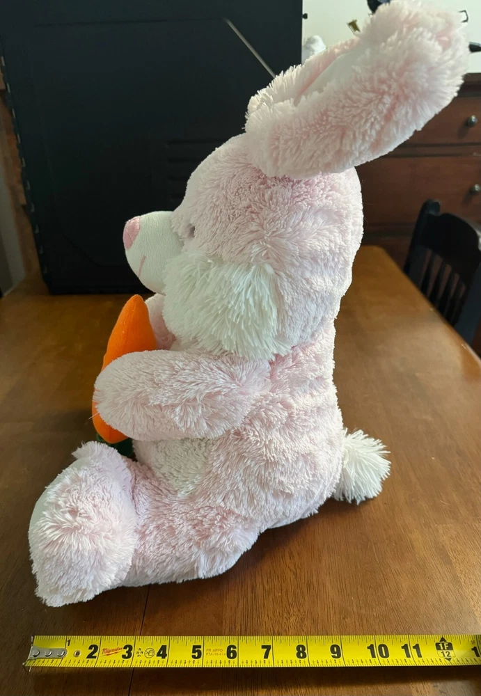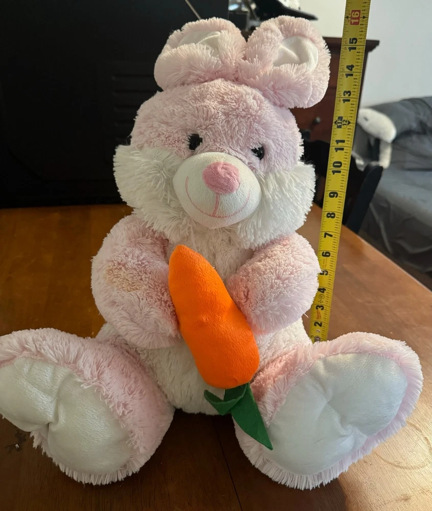 This medium-sized stuffed animal features a cute and cuddly pink and white rabbit design with a carrot nose and floppy ears. Perfect for Easter or any stuffed animal collection, this bunny rabbit is sure to bring joy and nostalgia to any child or adult. Measuring between 14-24 inches, this stuffed animal is the ideal size for hugging and displaying. The character family is Bunny Rabbit and it has not been modified in any way.