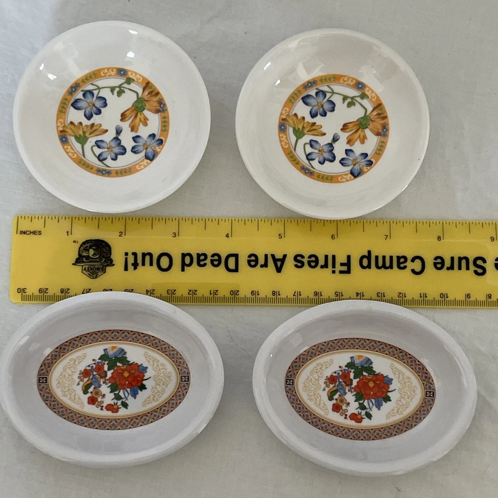 Melamine Ware ShunTa & TOMBOLO Set 4 Small Bowls Tea Bag Holders Sauce Flowers. Condition is Used. Shipped with USPS Ground Advantage.