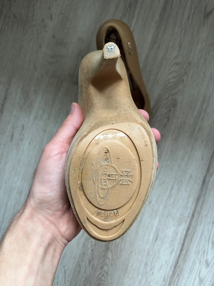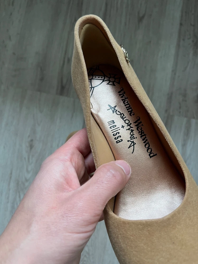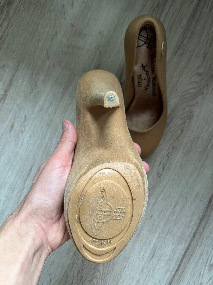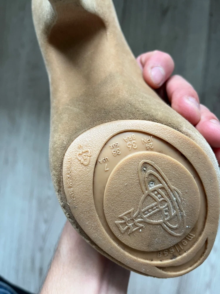Elevate your shoe game with these stunning Vivienne Westwood flats. The melissa velvet effect rubber shoes in a beautiful beige color are perfect for any occasion. These women's shoes are made with high-quality materials and are designed to provide comfort and style. The shoes are a US size 7 and are perfect for those who love flats. Add these shoes to your collection today and step out in style.