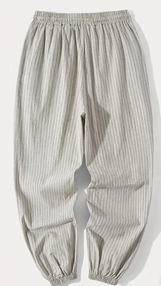 Men’s Cotton Linen Striped Joggers With Drawstring- Casual Loose Fit Pants