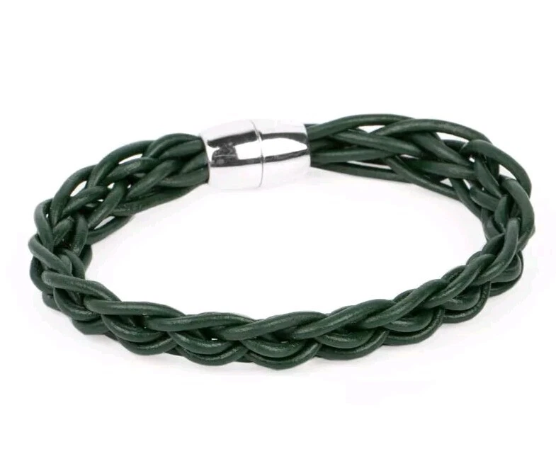 Leathery green cords intricately weave around the wrist, creating a rustic braid. Features a magnetic closure. Sold as one individual bracelet.