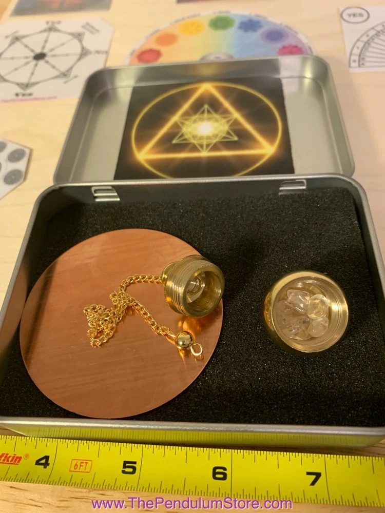 Unlock the Mysteries of the Universe with the Mermet Pendulum Kit: Your Gateway to Healing and Prosperity ๐ ๐ Experience the Mystical Power of the Brass Mermet Pendulum: A Revered Tool in Modern Radiesthesia ๐ Step into the world of divine energy and intuition with our meticulously crafted Brass Mermet Pendulum, a true replica of the pendulum used by the legendary Father Abbe Mermet, a pioneer in the field of Radiesthesia. This isn't just a pendulum; it's a bridge to the unseen energies of the world, a tool for those who seek to uncover the hidden truths and harness the power of vibrational healing. ๐ฎ Witness Chamber: A Portal to Higher Vibrations: The crowning feature of this pendulum is its large, ingeniously designed โWitness Chamber.โ Located at the top, this chamber opens to welcome the name or a physical sample of your target. Once inside, the Brass Mermet Pendulum transforms, resonating with the same vibrations as the sample, becoming a potent energy pendulum for your specific needs. ๐ซ A Versatile Instrument for Diverse Practices: Whether you are exploring healing, mineral prospecting, map dowsing, or general dowsing, the Mermet pendulum stands as a classic tool. Its popularity soars especially among homeopaths for broadcasting remedies across distances, making it an indispensable asset in your spiritual toolkit. ๐ Comprehensive Kit for Enhanced Experiences: Your journey with the Brass Mermet Pendulum is enriched with seven radionics images for healing and prosperity. The kit also includes three laminated pendulum dowsing charts - Yes/No Chart, Chakra Chart, and Numerical/Alphabetical Chart - each designed to guide you through different aspects of dowsing and energy reading. The addition of a copper radionics witness plate allows for a focused and intensified dowsing experience. ๐ Elegant Storage and Easy Portability: Housed in a stylish and durable lined storage tin (4.5x3.3x0.9 inches), your Brass Mermet Witness Pendulum is not only protected but also ready to accompany you on your travels or spiritual explorations. ๐ Exclusive Tutorial Series: To assist you in mastering the art of pendulum dowsing, we provide links to an evolving series of Tutorials. While these may feature different pendulums, the techniques and insights are universally applicable, ensuring that you can harness the full potential of your Brass Mermet Pendulum. ๐ Understanding Radiesthesia Frequencies: Every pendulum vibrates with a unique radiesthesia energy, tailored to specific purposes like healing, finding lost objects, or locating water sources. Our Brass Mermet Pendulum is specifically tuned to align with these diverse frequencies, ensuring that it meets your individual needs and explorations. Pendulum Kit Tutorials: https://youtu.be/DT4gM08ppHo https://youtu.be/xNJmktAHQT4 https://youtu.be/raJQOf8v1Wo Discover Alignment with Your Inner Guidance Embark on a journey of deep self-discovery and spiritual alignment with our unique offerings. We believe that the key to finding the most resonant tools and experiences lies within your own intuitive wisdom. Before making a selection, we invite you to engage in a moment of reflection with your pendulum, allowing it to guide you towards what will serve you best at this point in your journey. Here's a simple guide to help you connect with your inner guidance: Center Yourself: Find a quiet space where you can focus without distractions. Take a few deep breaths to ground yourself and enter a state of calm receptivity. Hold Your Pendulum: Grasp your pendulum gently, holding it over the center of your open palm or over the images/descriptions of our offerings. Set Your Intention: Silently or aloud, ask your higher self to guide you towards the offerings that will bring the most value and growth to your life right now. Observe the Response: Release any expectations and watch the movement of your pendulum. A swing in any particular direction can be your intuitive guidance speaking to you. Trust Your Guidance: Whether it directs you towards a specific offering or suggests waiting, trust that this intuitive process is leading you to exactly where you need to be. Our creations, inspired by timeless wisdom and aimed at nurturing your spiritual growth, are here to support you. Let your pendulum guide you to what resonates best, be it for healing, abundance, or transformative change. This is an invitation to align your choices with your soul's path, ensuring that what you bring into your life is perfectly attuned to your deepest needs and aspirations. May your journey be illuminated by the clarity and wisdom that resides within you.